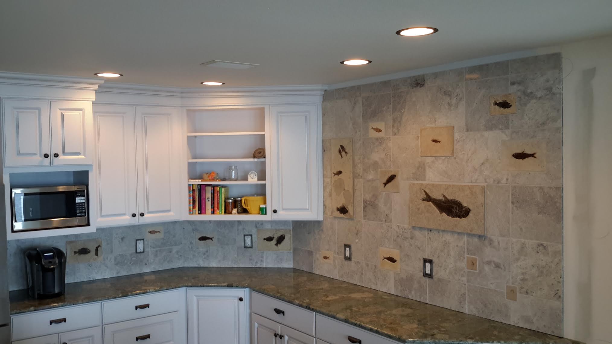 We had a customer come buy the warehouse about a month ago that wanted to by about a dozen fossil fish plates from the Green River Formation to inlay into a backsplash in their remodeled kitchen. They sent us this photo of the wonderful results.