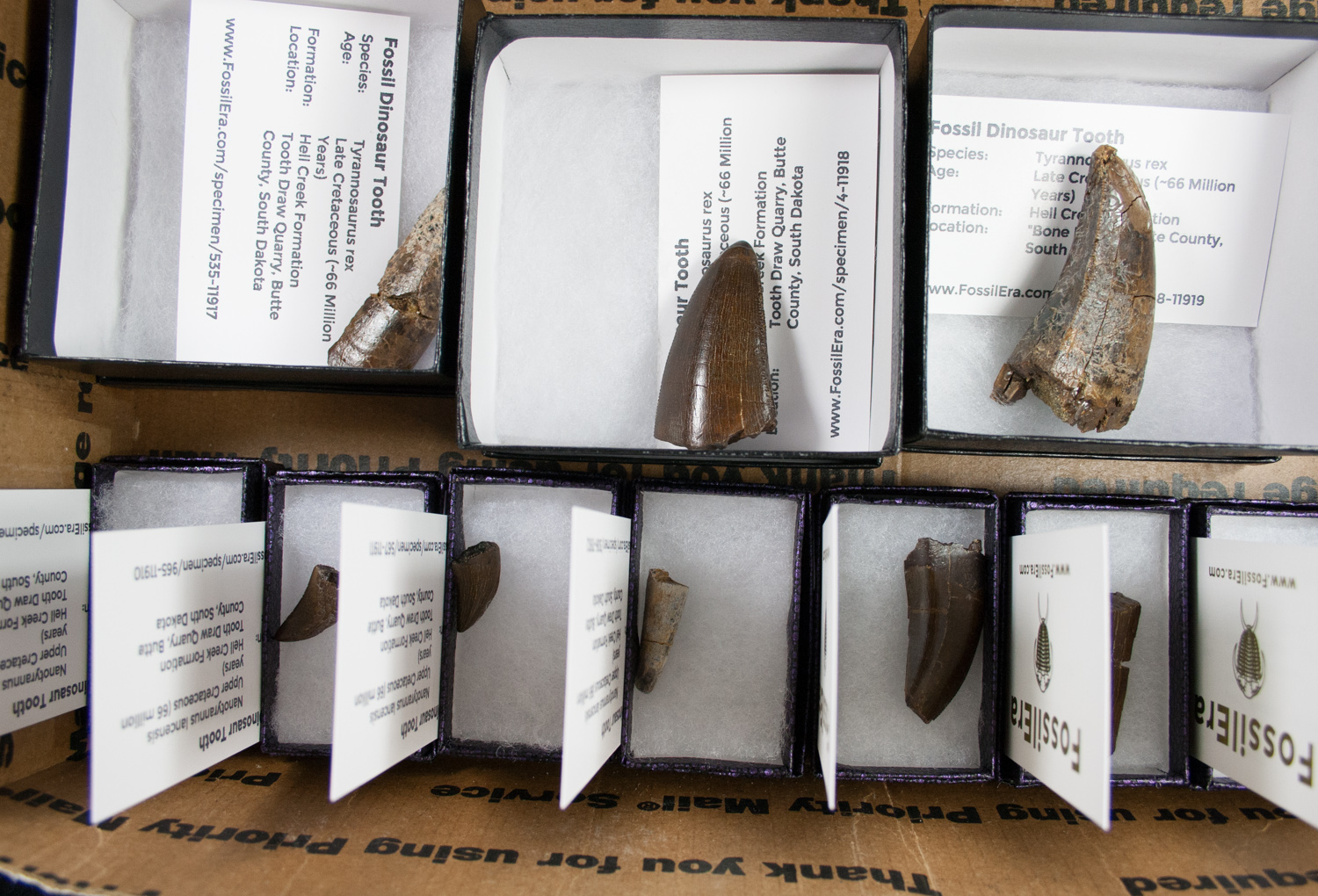 We just received a number of fossil Tyrannosaur (T-Rex & Nanotyrannus) teeth from the Hell Creek Formation of South Dakota. Tyrannosaurid teeth are typically are one of the fastest selling fossils we have and because of their collectability are hard for us to acquire.