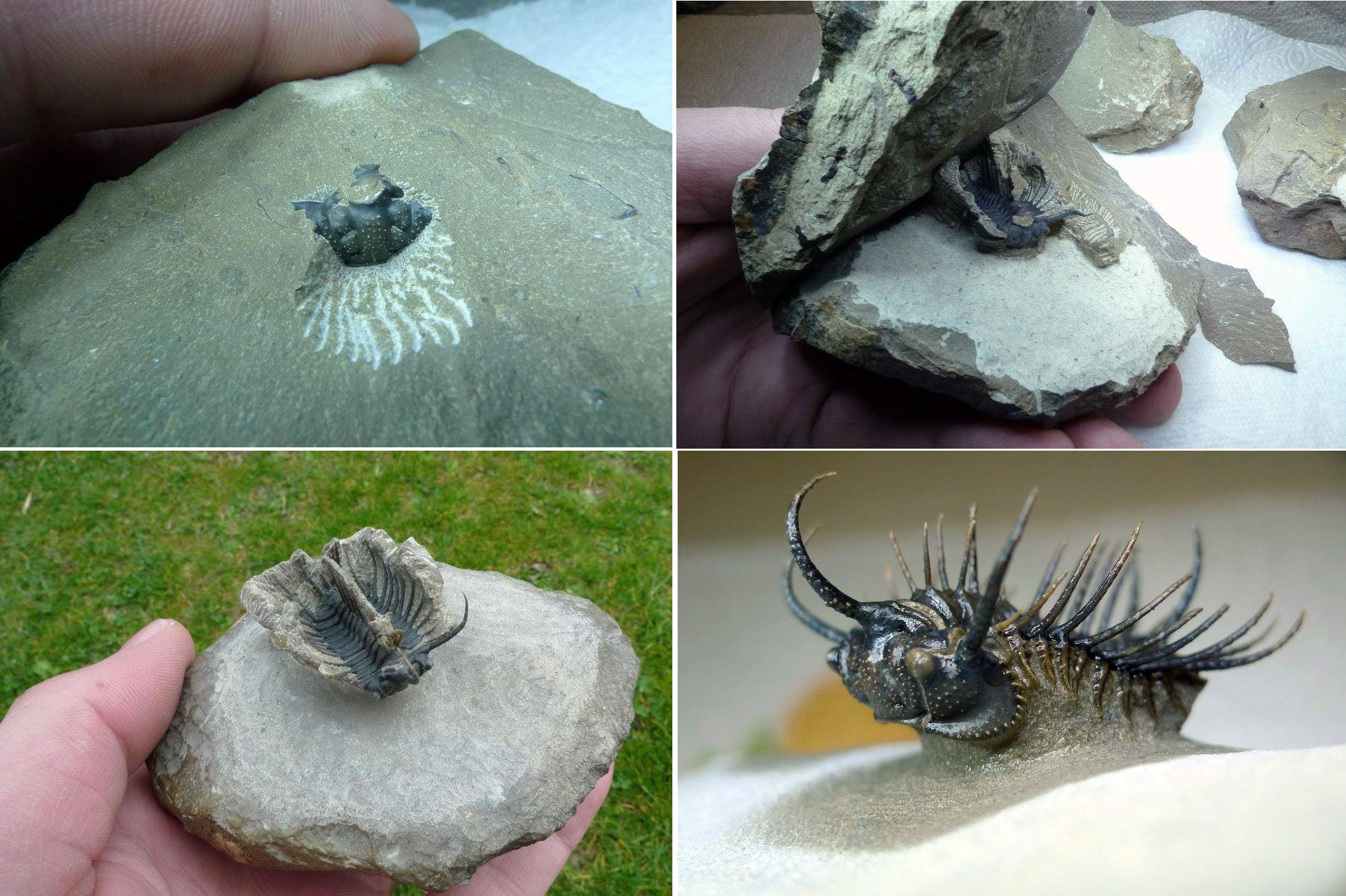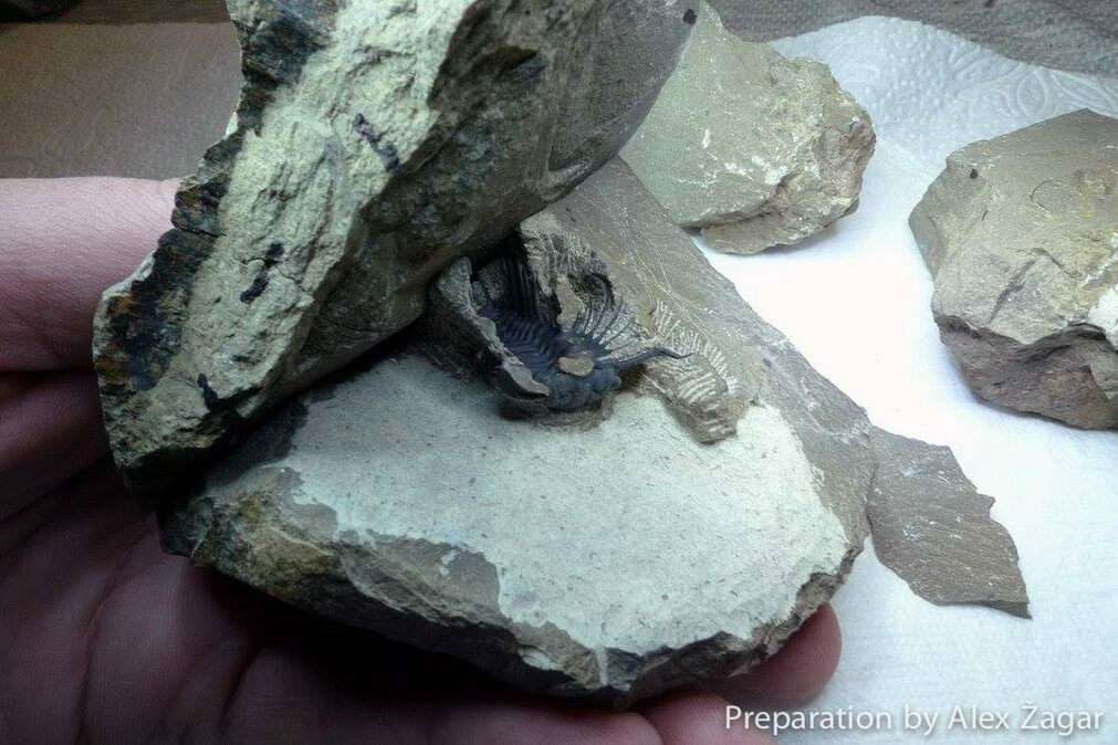 The trilobites are found within a hard limestone by breaking the rock into progressively smaller pieces and looking for thin cross-sections. This is backbreaking work, but once the trilobite back in the preparation lab the detailed work begins. The rock must be meticulously removed from around the trilobites under magnification using airscribes and air abrasives. It takes many hours to prepare even some of the less ornate trilobites.