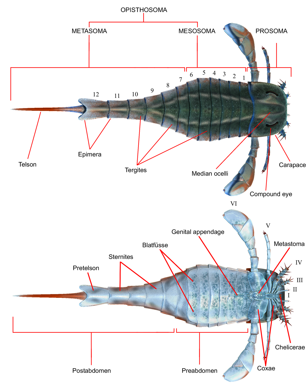 Eurypterids, commonly known as sea scorpions, are an extinct group of arthropods related to arachnids and include the largest known arthropods to have ever lived. Prevalent during the Silurian and Devonian, eurypterids had segmented bodies with compound eyes and two club-like "arms." Some species exhibit toothed claws, and may therefore have been predators.