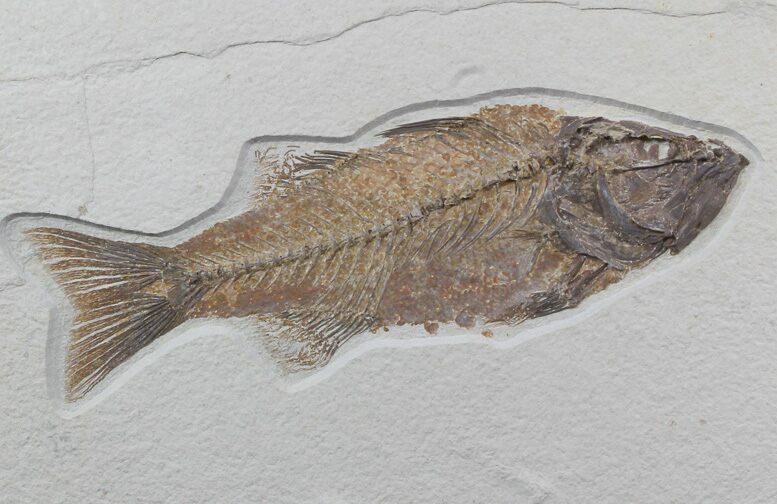 One of the more uncommon fish coming out of the Green River Formation is the perciform Mioplosus. This fish could grow to lengths of up to 20 inches, but averaged about 5 to 7 inches. They were believed to be successful predators in the northern hemisphere's freshwater environments during the Eocene epoch. Large adult Mioplosus specimens are often pulled from the 18-inch layer of the Green River formation, which is characterized by exquisite and highly detailed brown-black preservation on a light cream limestone. These specimens make a phenomenal display piece, especially when fossilized with a mid-dinner mouthful!
