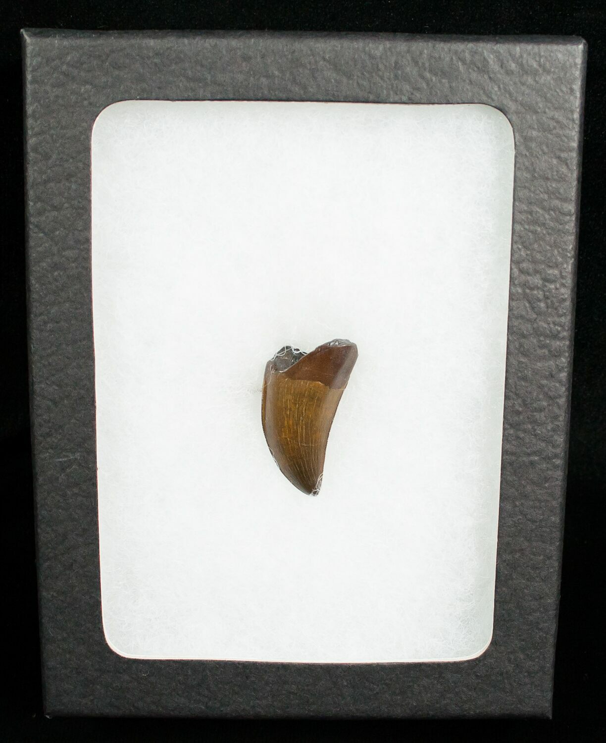 This is an great Nanotyrannus lancensis tooth from the Hell Creek Formation of South Dakota. It's 1.03 inches in length, has flawless enamel and serrations. Really a collector quality tooth. It comes with a riker mount display case.