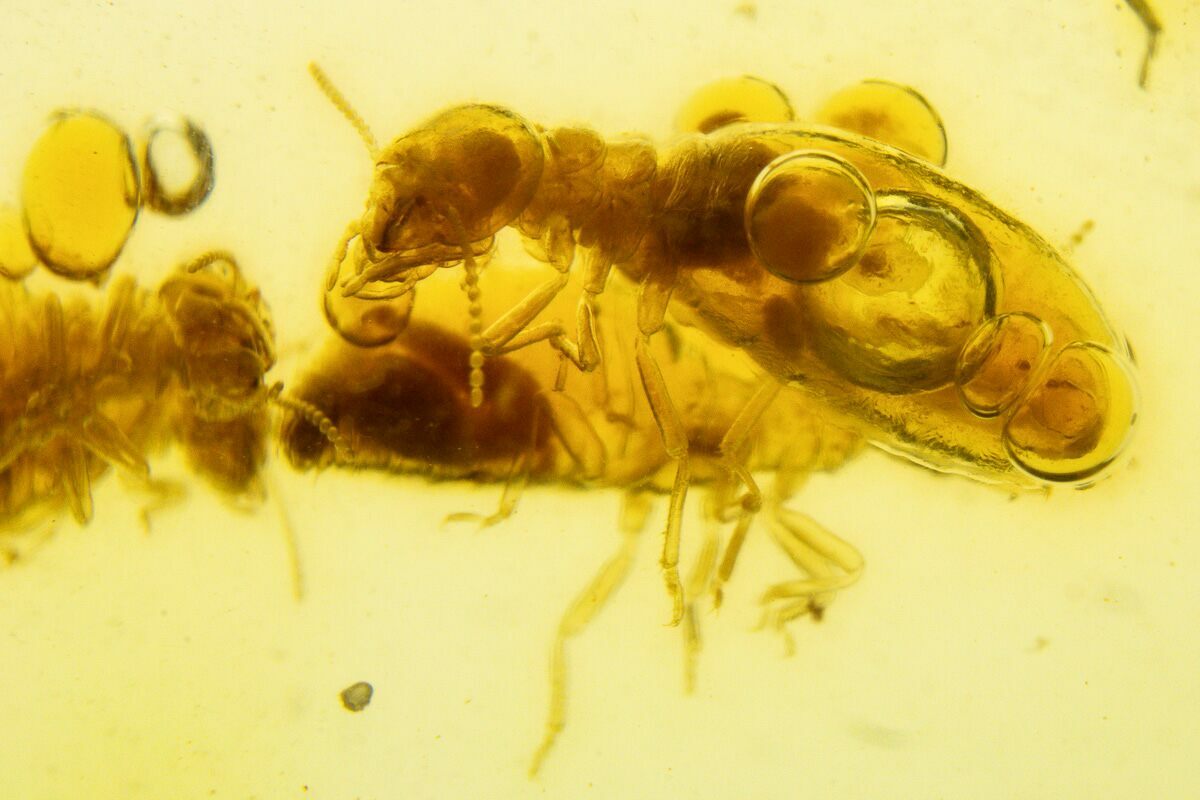 This is a polished piece of copal from Colombia. It contains several termite (infraorder Isoptera) fossils and what appear to be multiple larvae. Within one of the termite's abdomens, an enhydro (air bubble in water) can be seen with the naked eye. The copal bears gorgeous golden honey coloration, measures 1.03" wide, and weighs 10.1 grams. The entire specimen has been polished to a glossy-finish.