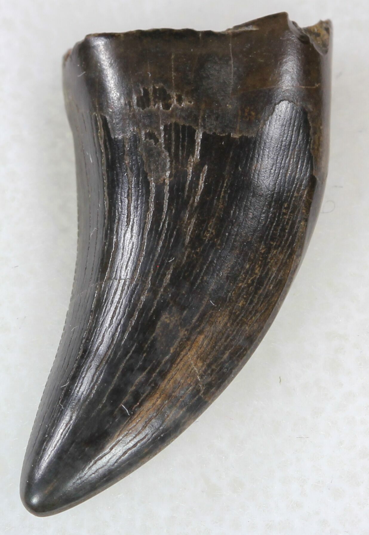 This is a 1.03" long Tyrannosaur tooth from the Hell Creek Formation of Montana. The tooth has nice, dark colored enamel and was collected from a private ranch in Powder River County, Montana. Most of the serrations are worn but there is no repair or restoration. It either came from a juvenile T-Rex or Nanotyrannus lancensis. Comes in an acrylic display case.