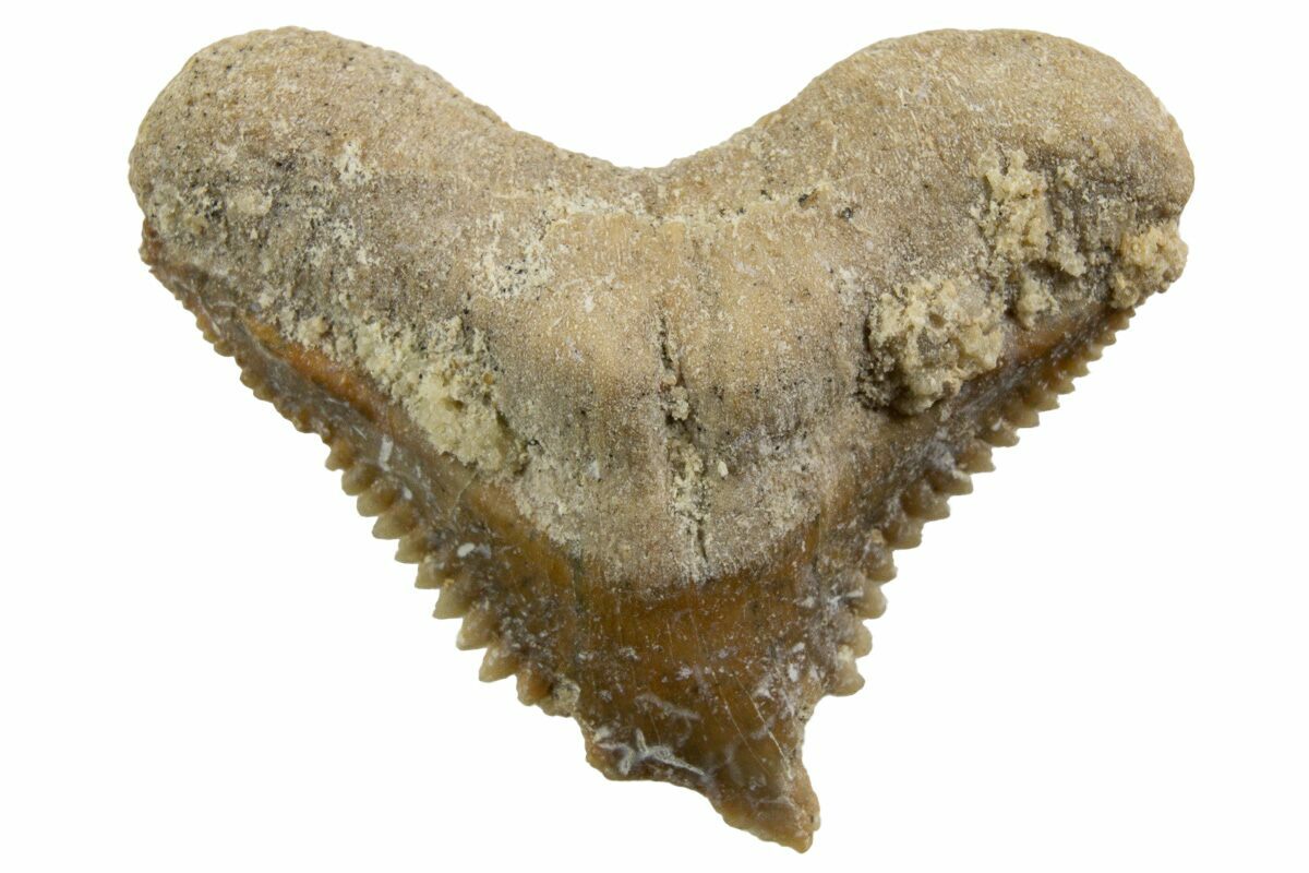 This is a 1.04" long, serrated, fossil Tiger Shark (Galeocerdo eaglesomi) tooth from the Eocene aged deposits near Dakhla, Morocco. Galeocerdo eaglesomi would be one of the early Tiger Sharks living approximately 45 million years ago.