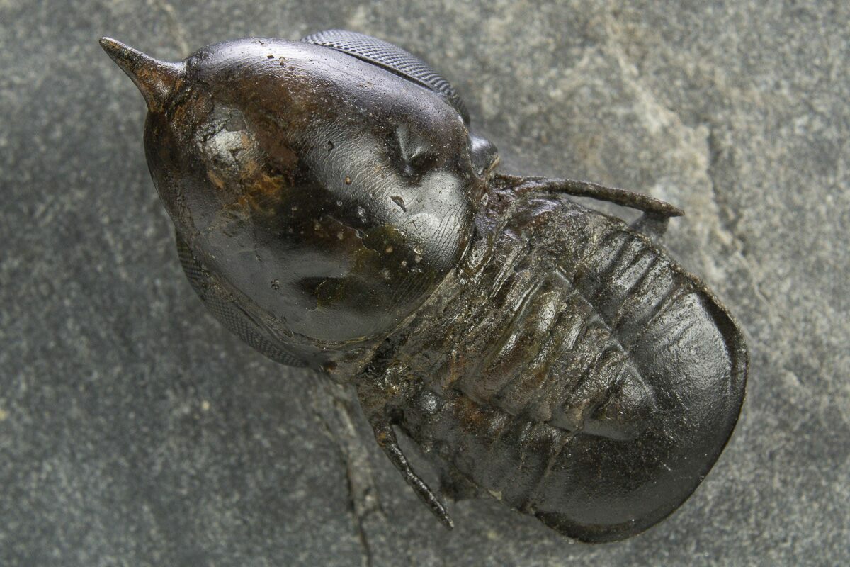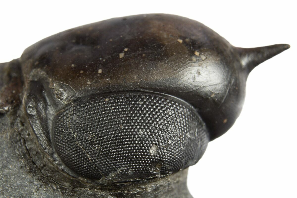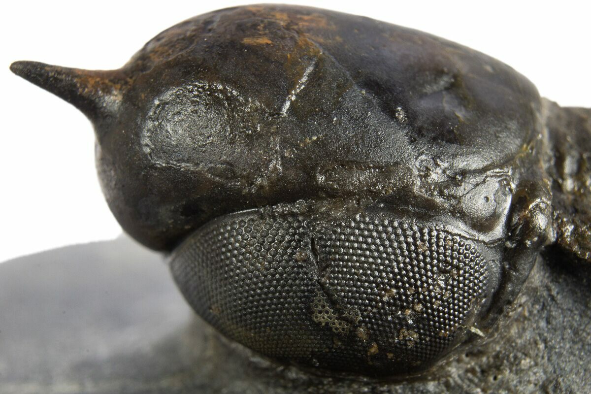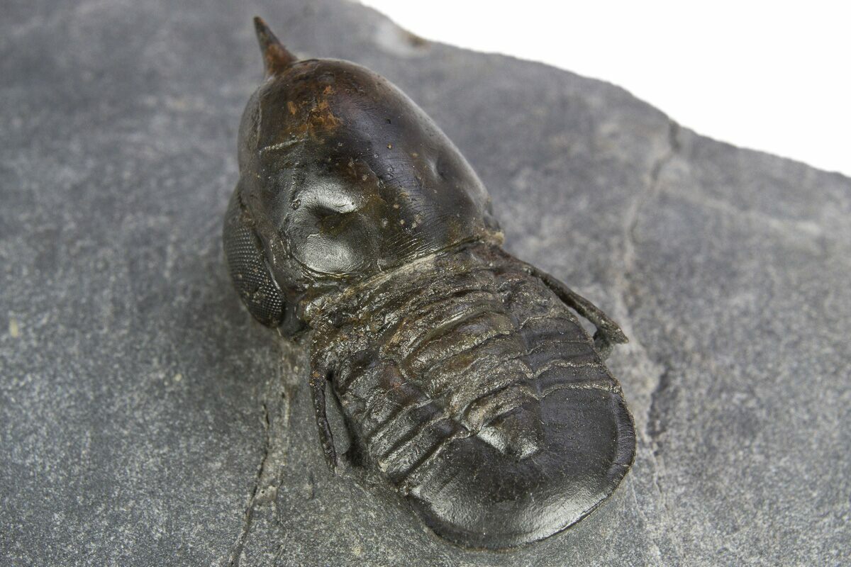 This is an exceptional, 1.05" long example of an unusual pelagic trilobite (Cyclopyge) from El Kaid Rami, Morocco. Nearly all of the Cyclopyge you see from Morocco are flattened on shale and not 3D like this specimen. Both eyes on this specimen have incredible preservation.