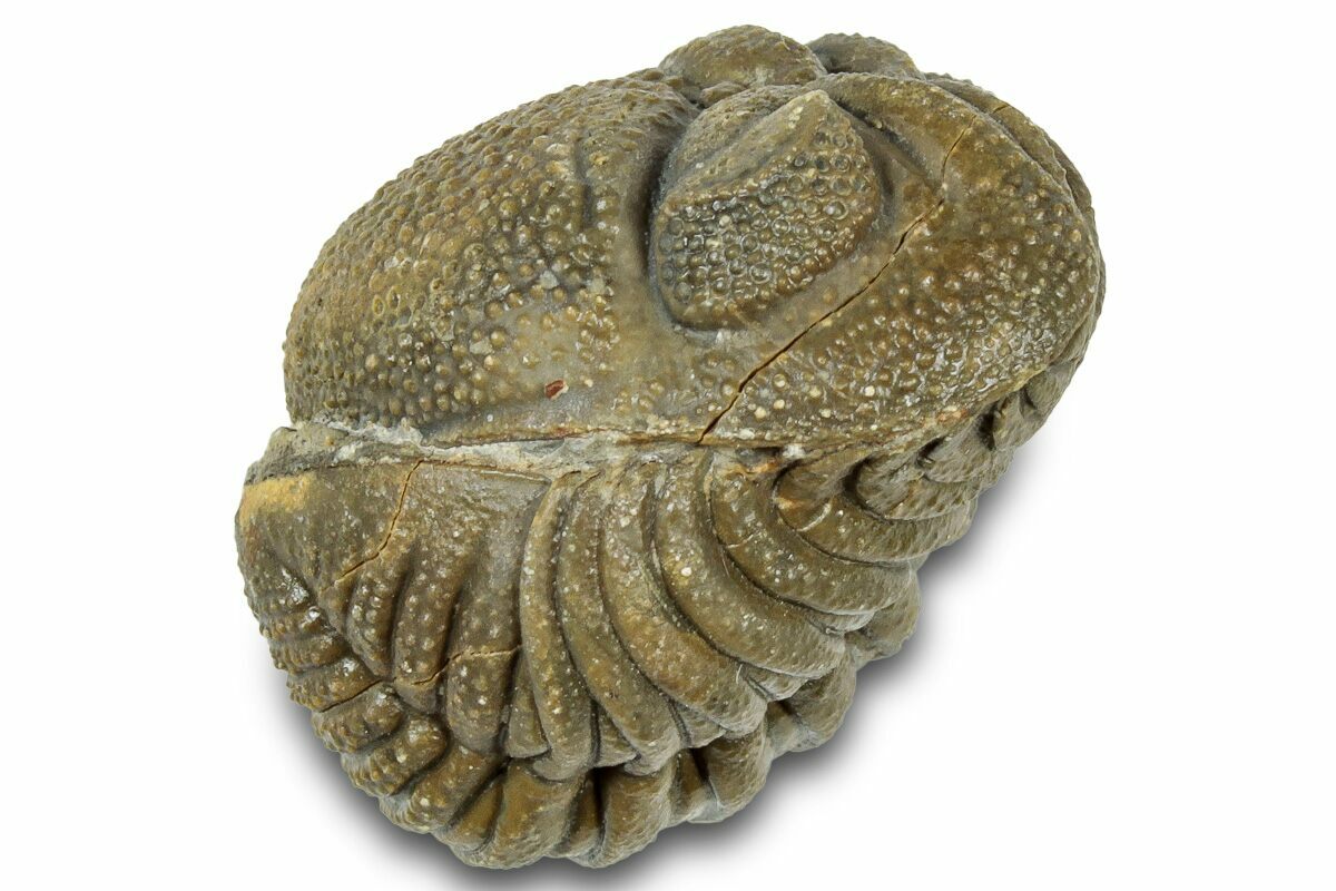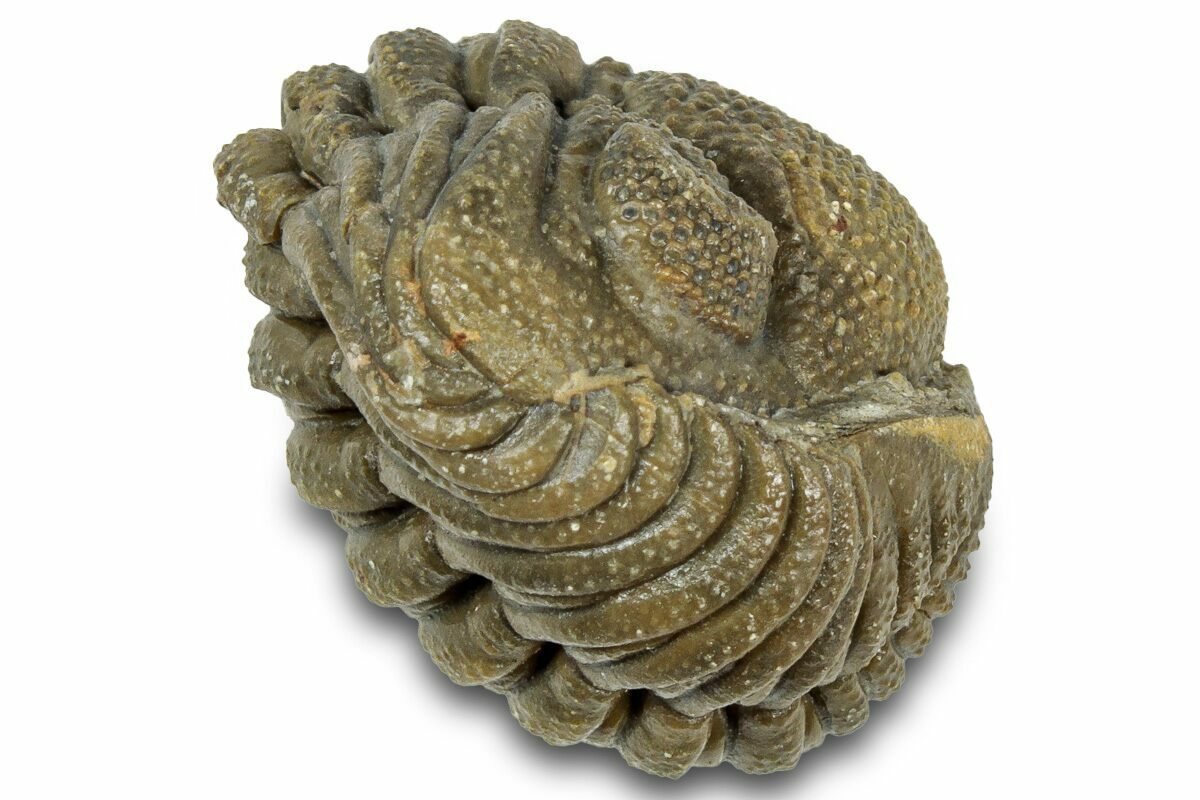 This is an enrolled, 1.05" wide Morocops trilobite from Morocco. It has a very bumpy shell and visible eye facet detail in both eyes.
