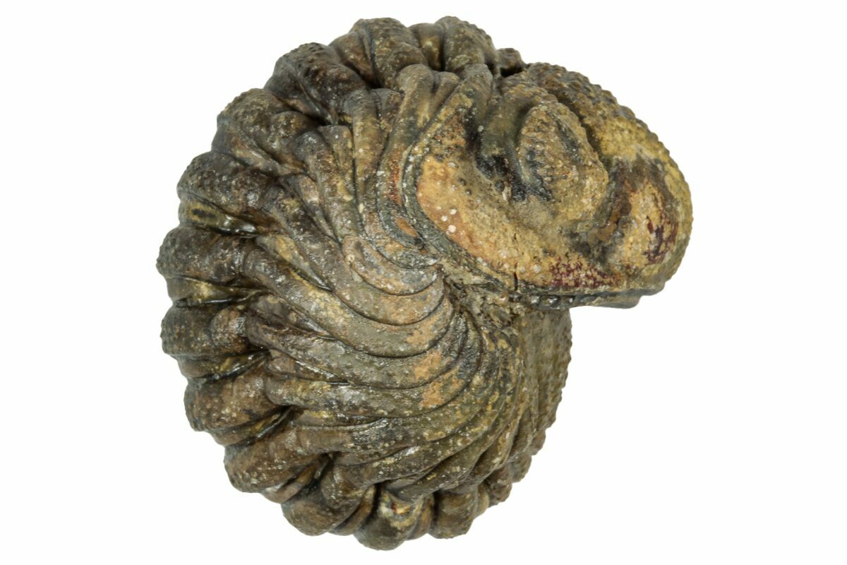 This is an enrolled, 1.05" wide Morocops trilobite from Morocco. Preserved eye facets can be seen in the left eye, though the right eye has weathering.