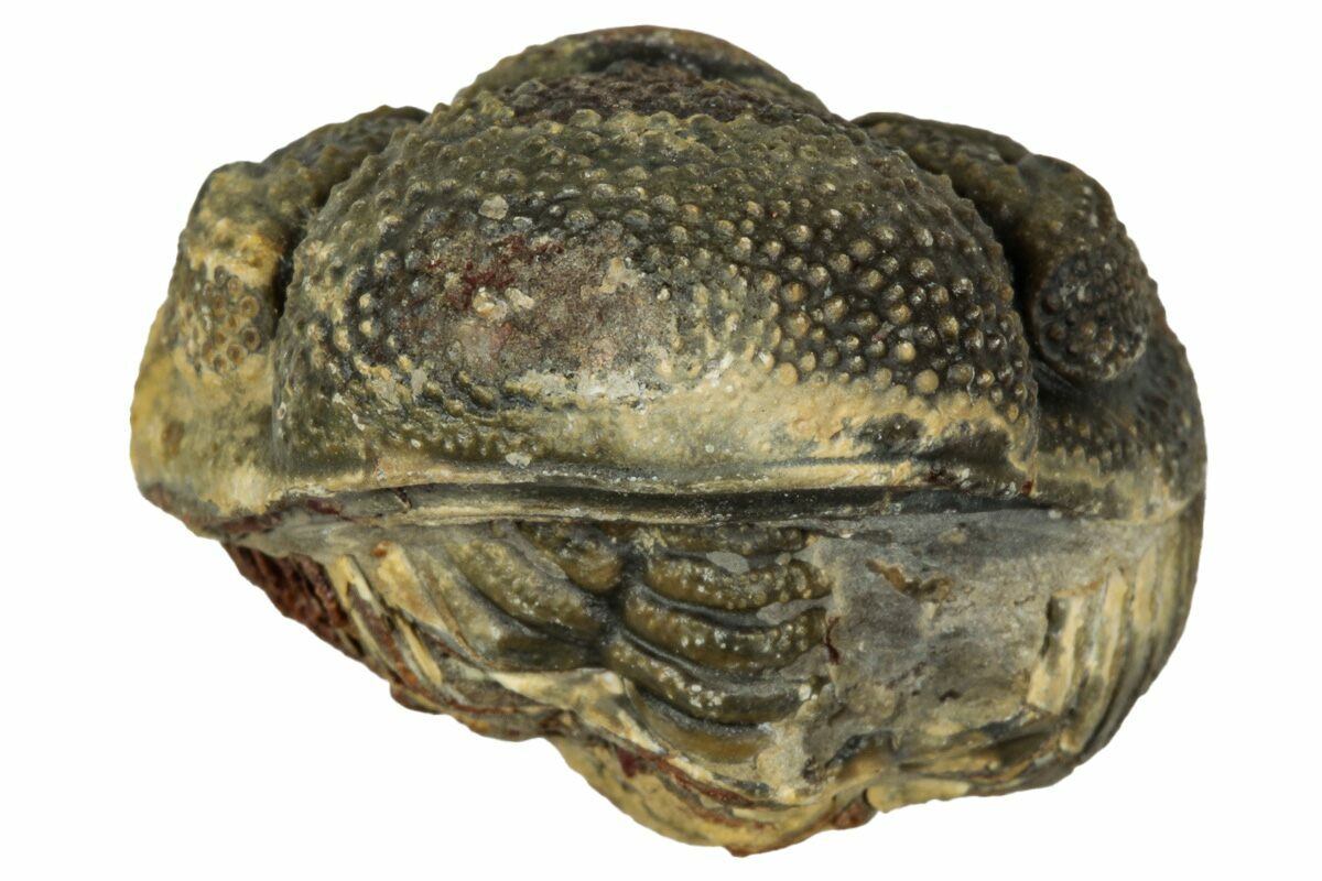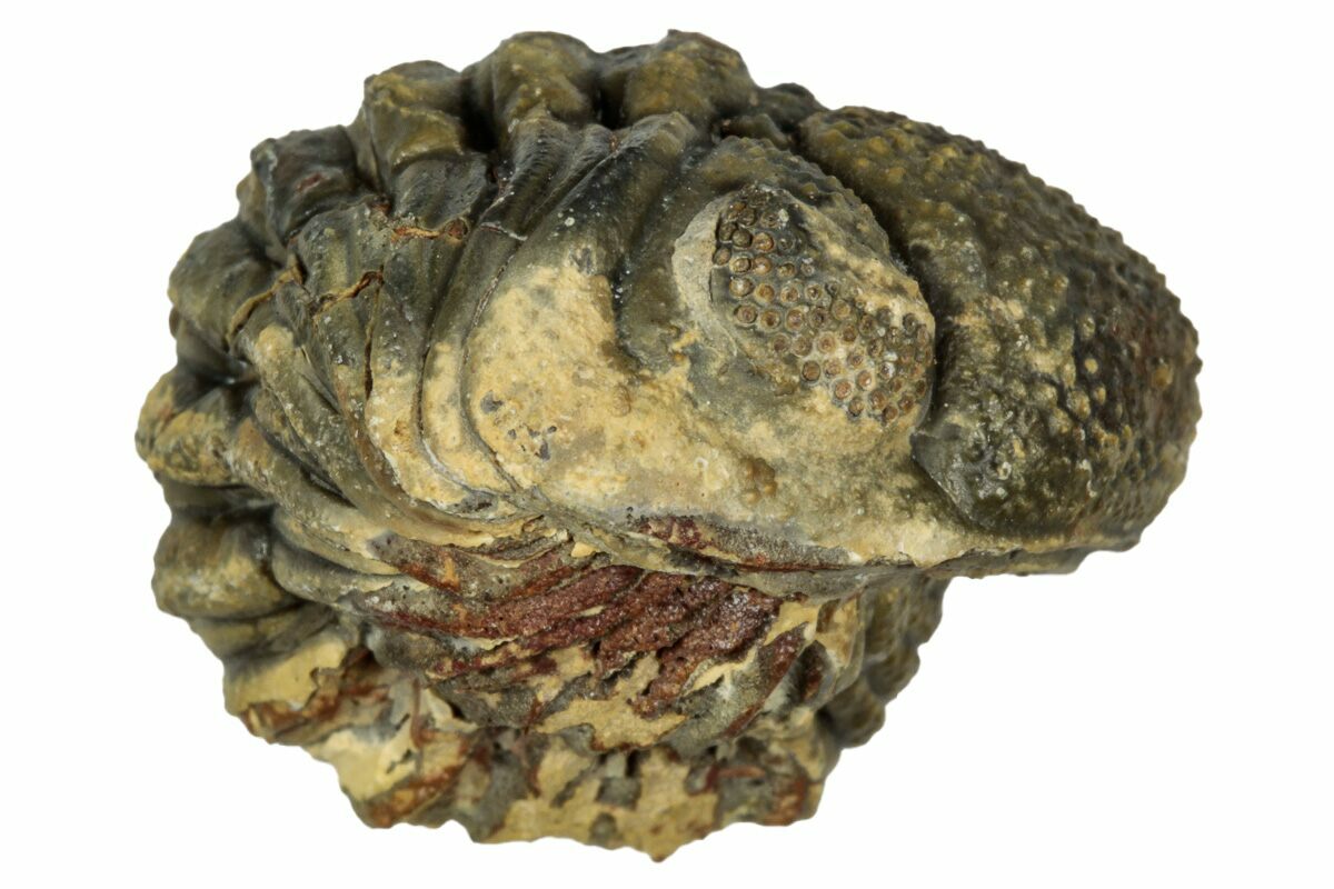 This is an enrolled, 1.05" wide Morocops trilobite from Morocco. Preserved eye facets can be seen in both eyes.