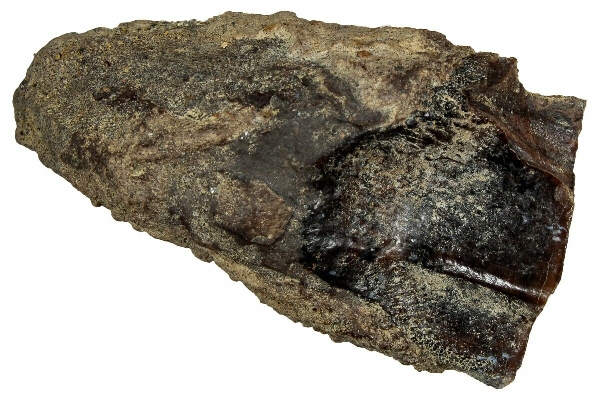 This is an authentic tooth from the iconic horned dinosaur, Triceratops horridus, collected from the Hell Creek Formation of Montana. Triceratops possessed a massive “dental battery” made up of hundreds of tightly packed teeth, perfectly designed for slicing and grinding tough, fibrous plants. As these teeth wore down, they were continuously replaced—collectors often refer to the shed examples like this as “spitters.”