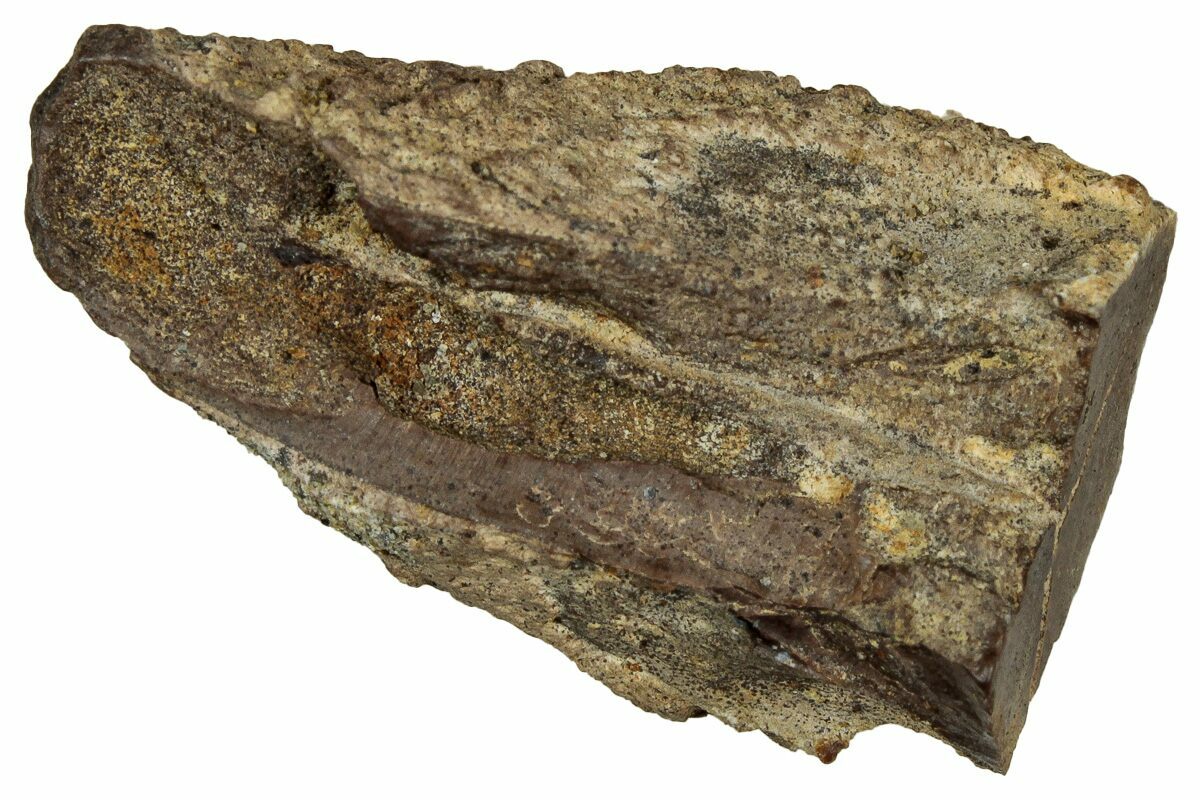 This specimen is one of those naturally shed teeth and features a polished chewing surface, showing clear evidence of the wear that came from processing vegetation millions of years ago.