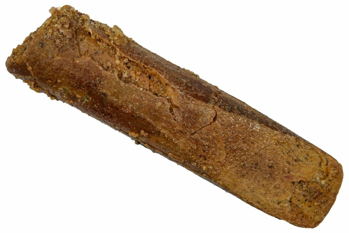 This is a 1.08" long tooth of a Moroccan diplodocid sauropod, likely either Nigersaurus sp. or Rebbachisaurus garasbae. It comes from the Late Cretaceous Kem Kem beds of Morocco, home to such meat eating giants as Spinosaurus and Carcharodontosaurus.