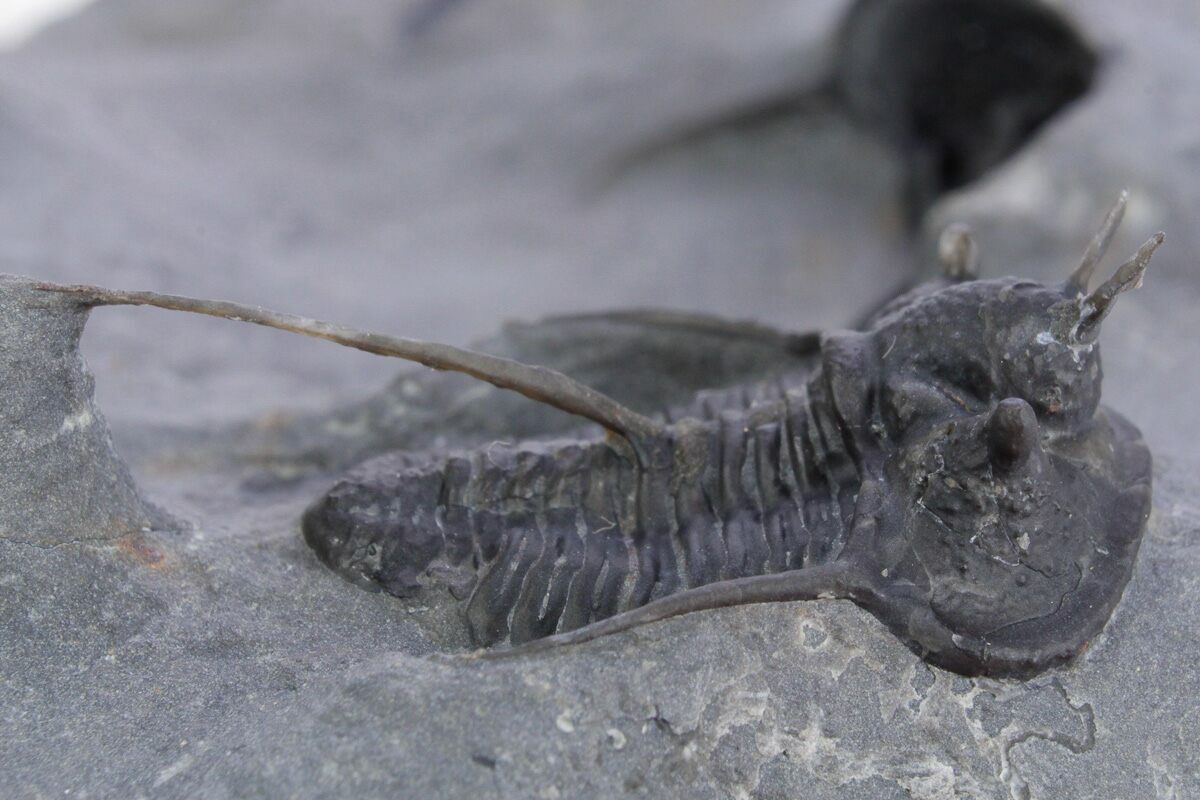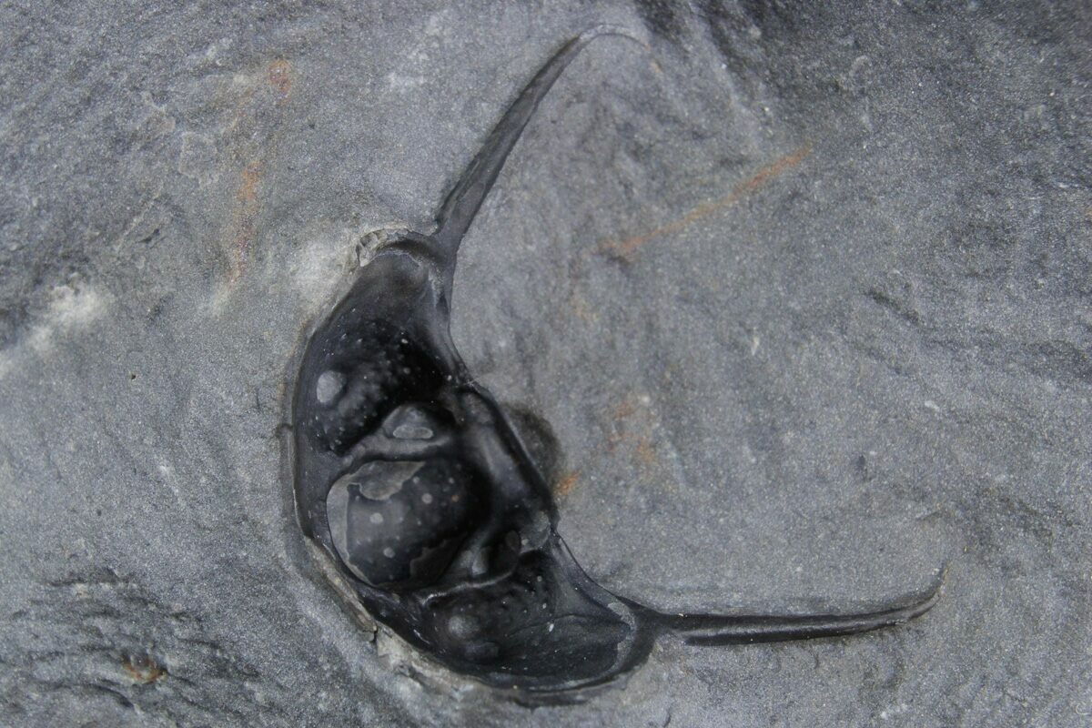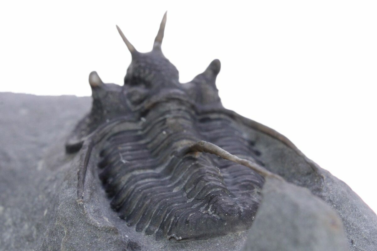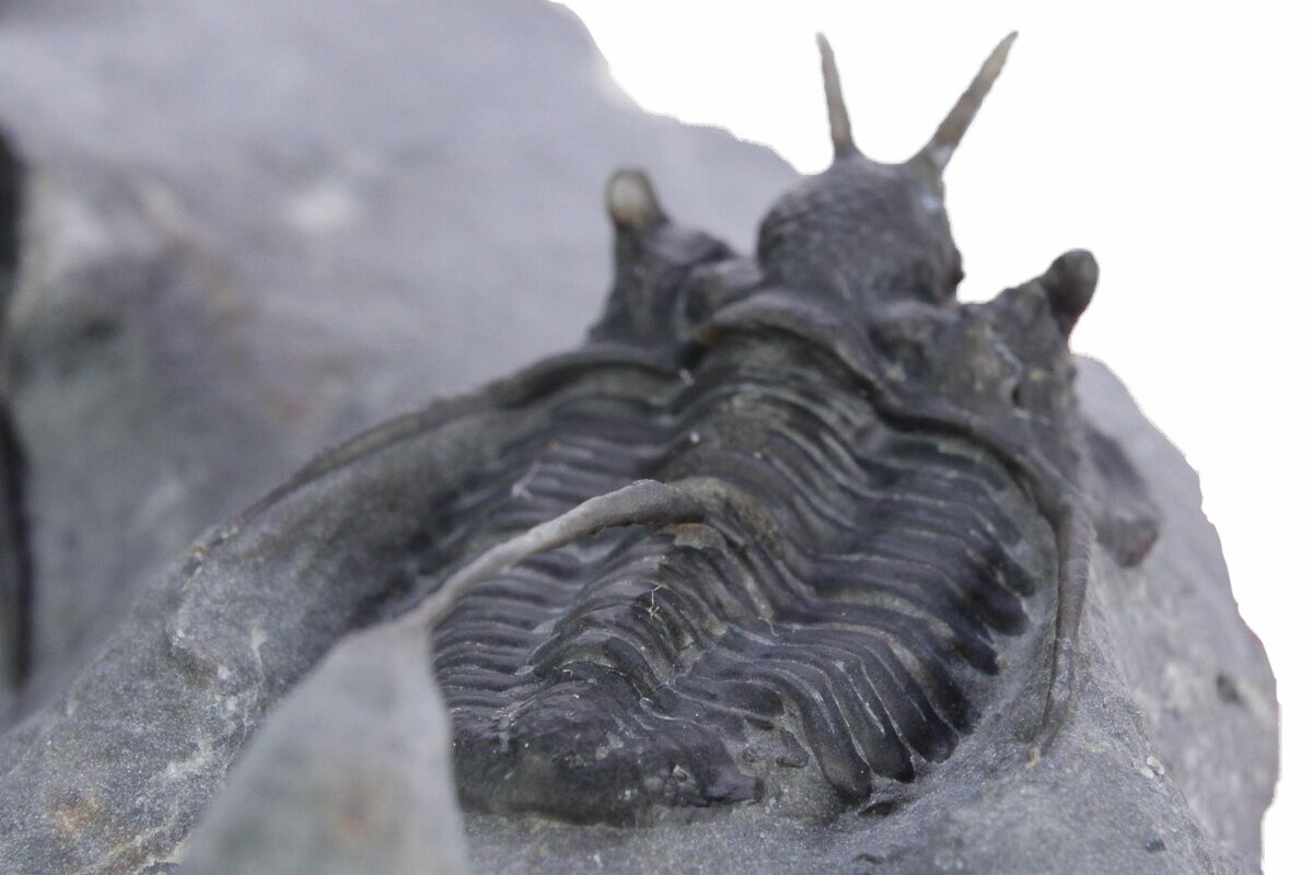 Here is nice, 1.1" long example of the Devonian trilobite Cyphaspis walteri sometimes referred to as the "Devil Horn" Cyphaspis for obvious reasons. It is nicely prepared with free-standing spines and about 2% shell restoration. There are two heads of Cyphaspis, one ventral and one dorsal associated with it.