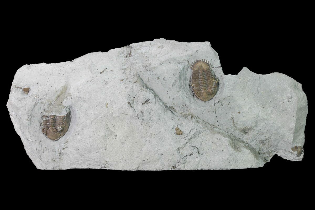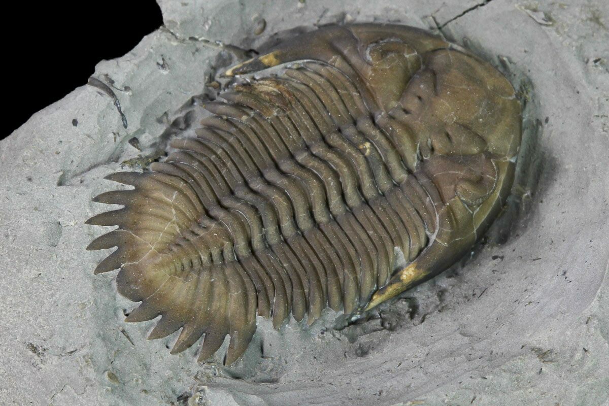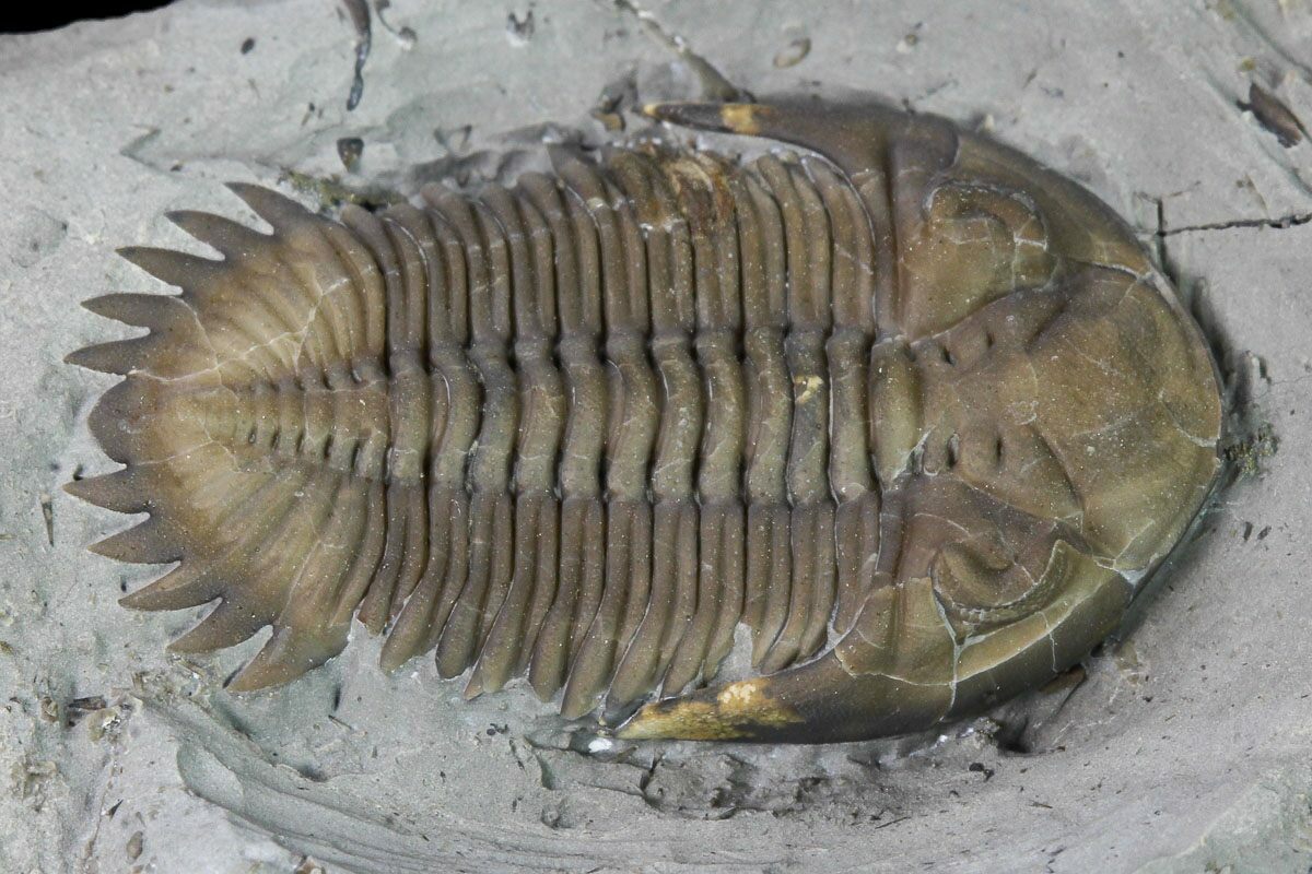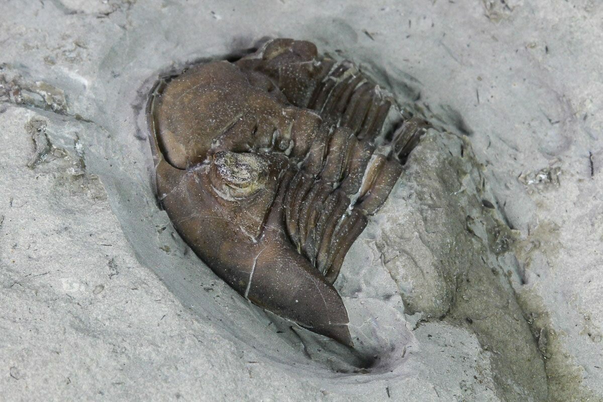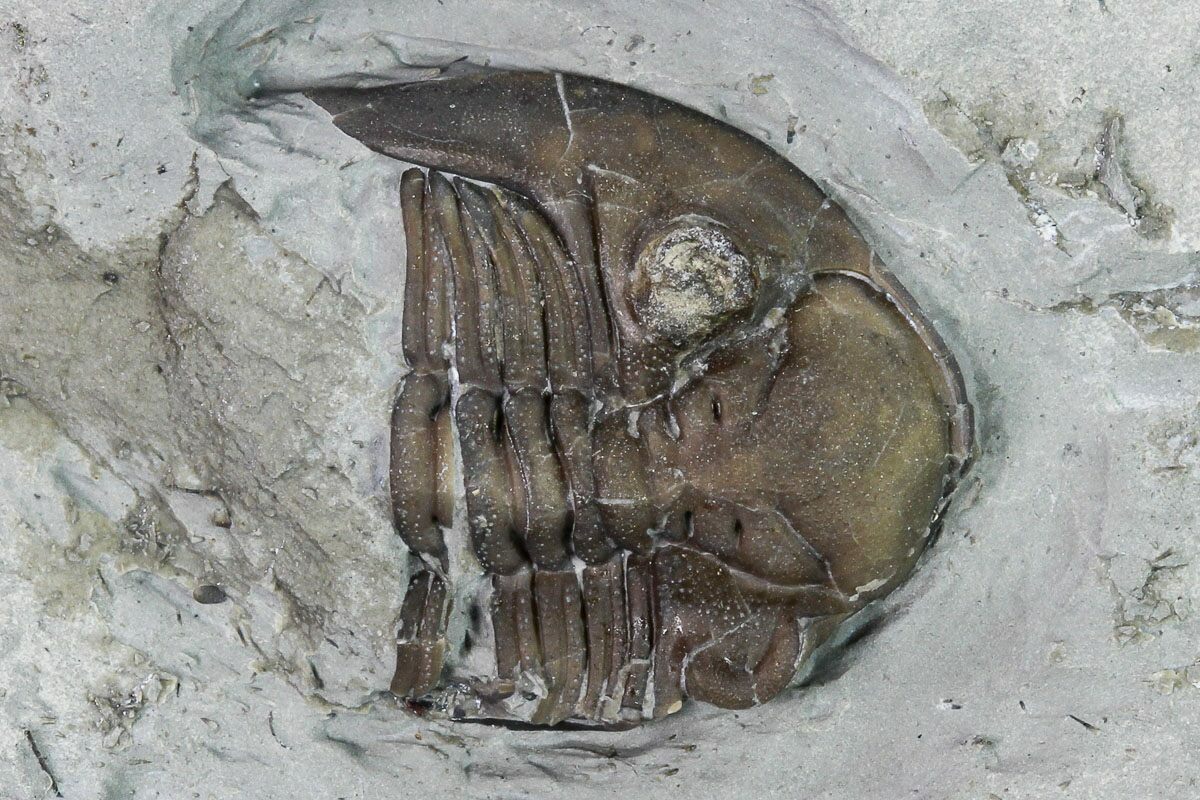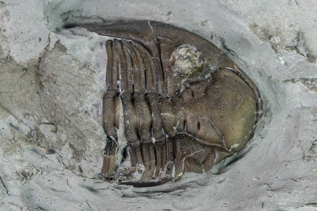 This is a beautiful, 1.1" long Greenops widderensis trilobite from Arkona, Ontario. There is a second partial specimen associated with it on the piece of limestone.