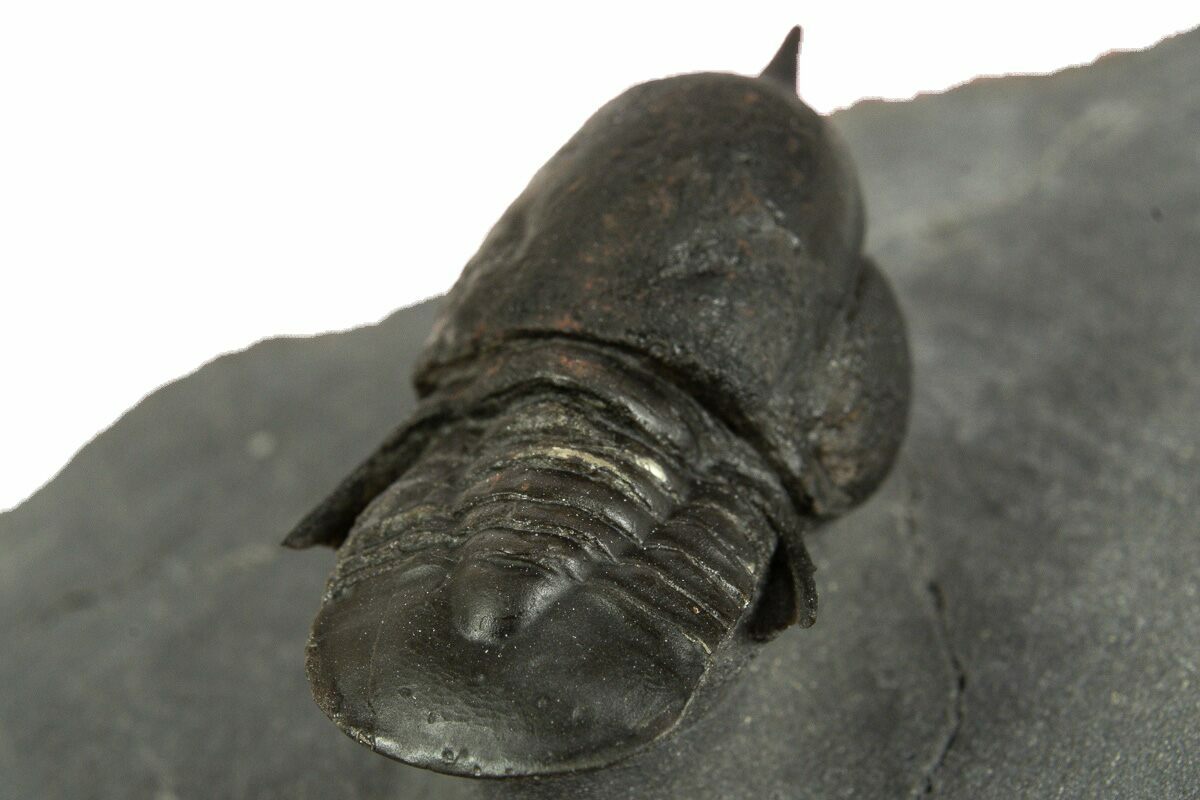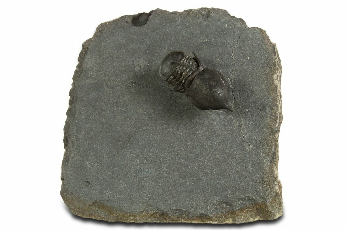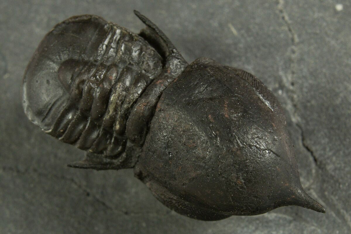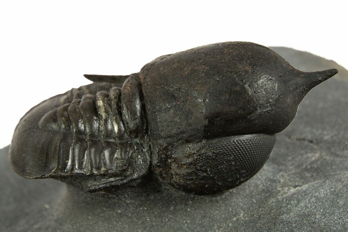 This is an exceptional 1.1" long example of an unusual pelagic trilobite (Cyclopyge) from El Kaid Rami, Morocco. Nearly all of the Cyclopyge you see from Morocco are flattened on shale and not 3D like this specimen. Both eyes on this specimen have incredible preservation.