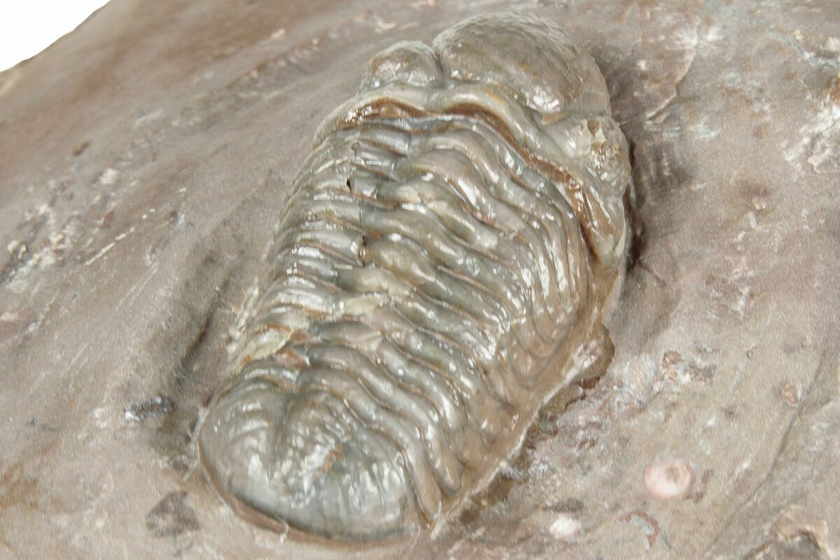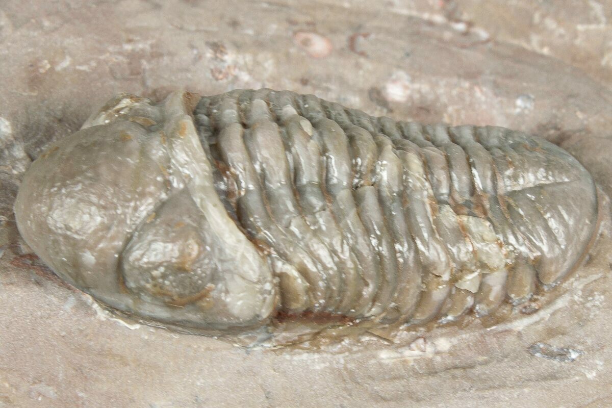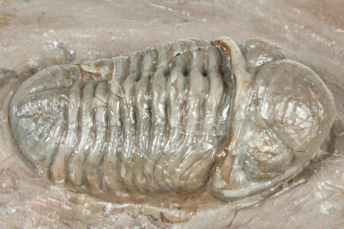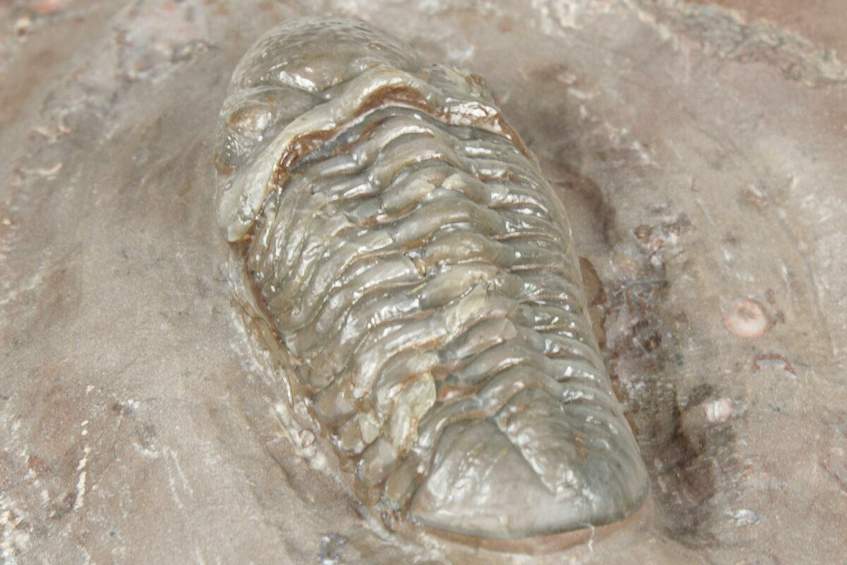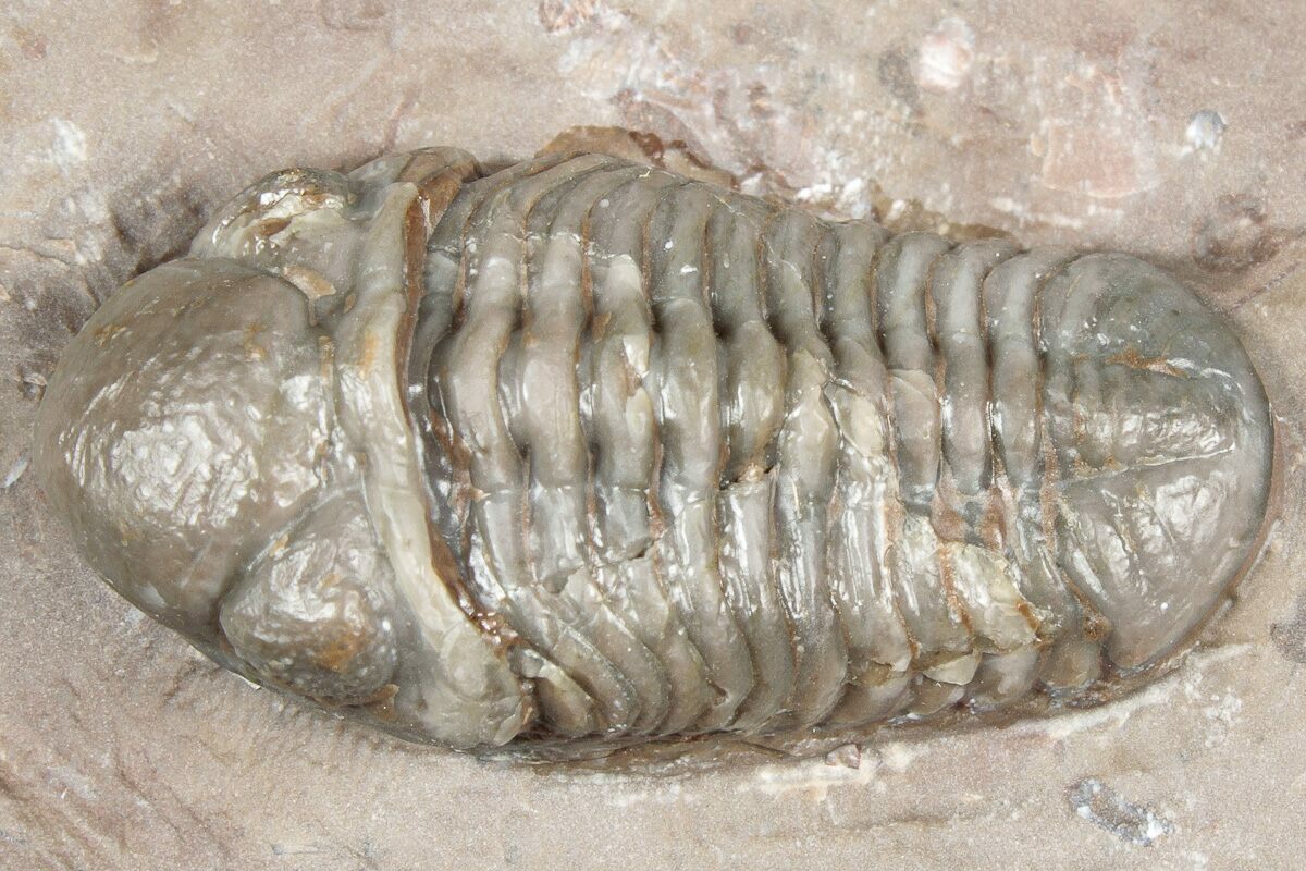 Trilobites are collected from a 15-meter-thick section about 6kilometers northwest of Jorf, Morocco. Unlike many other localities, these rocks do not have distinct deposition layers, but rather are massive. They likely represent a gigantic "mud mound" that formed at the base of a volcanic island due to mud slides. The rock is very silicified, almost like a chert, and can be quite colorful. The actual shells on the trilobites are translucent: the trilobite tends to be the color of the rock it sits on.