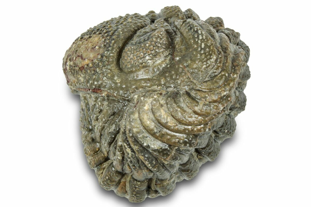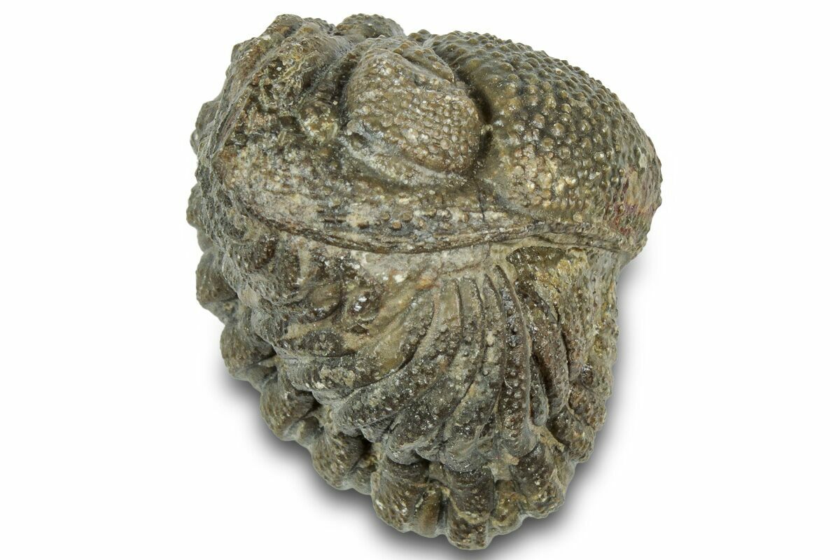 This is an enrolled, 1.1" wide Morocops trilobite from Morocco. It has a very bumpy shell and visible eye facet detail in both eyes.