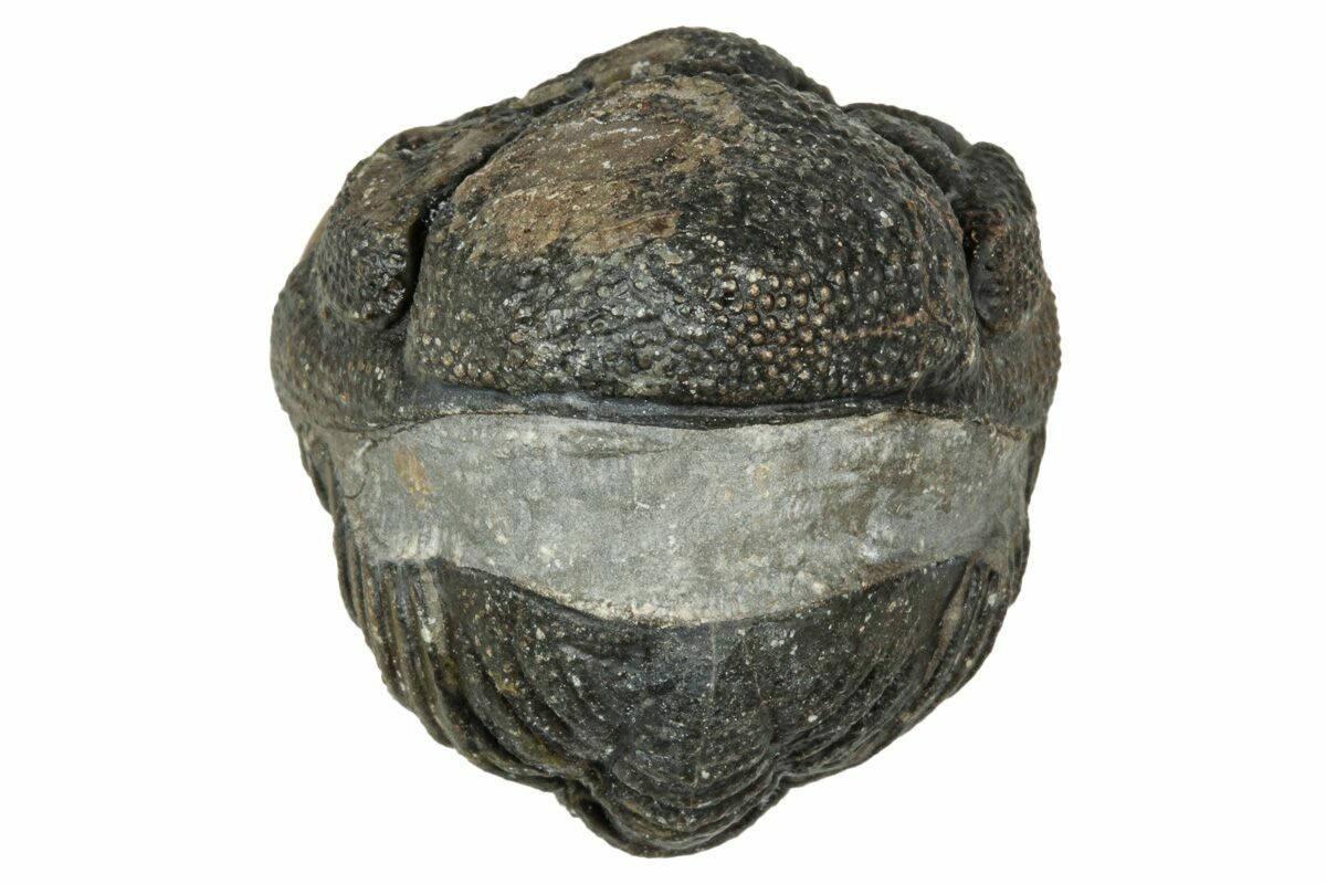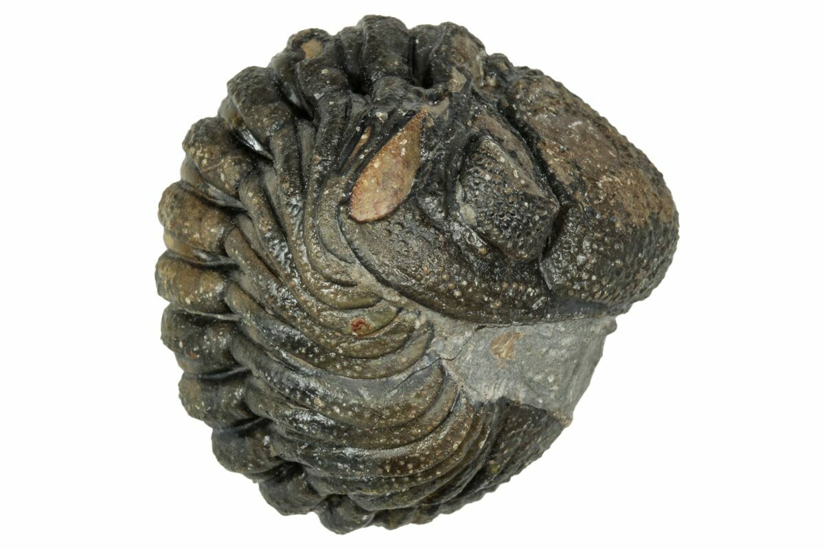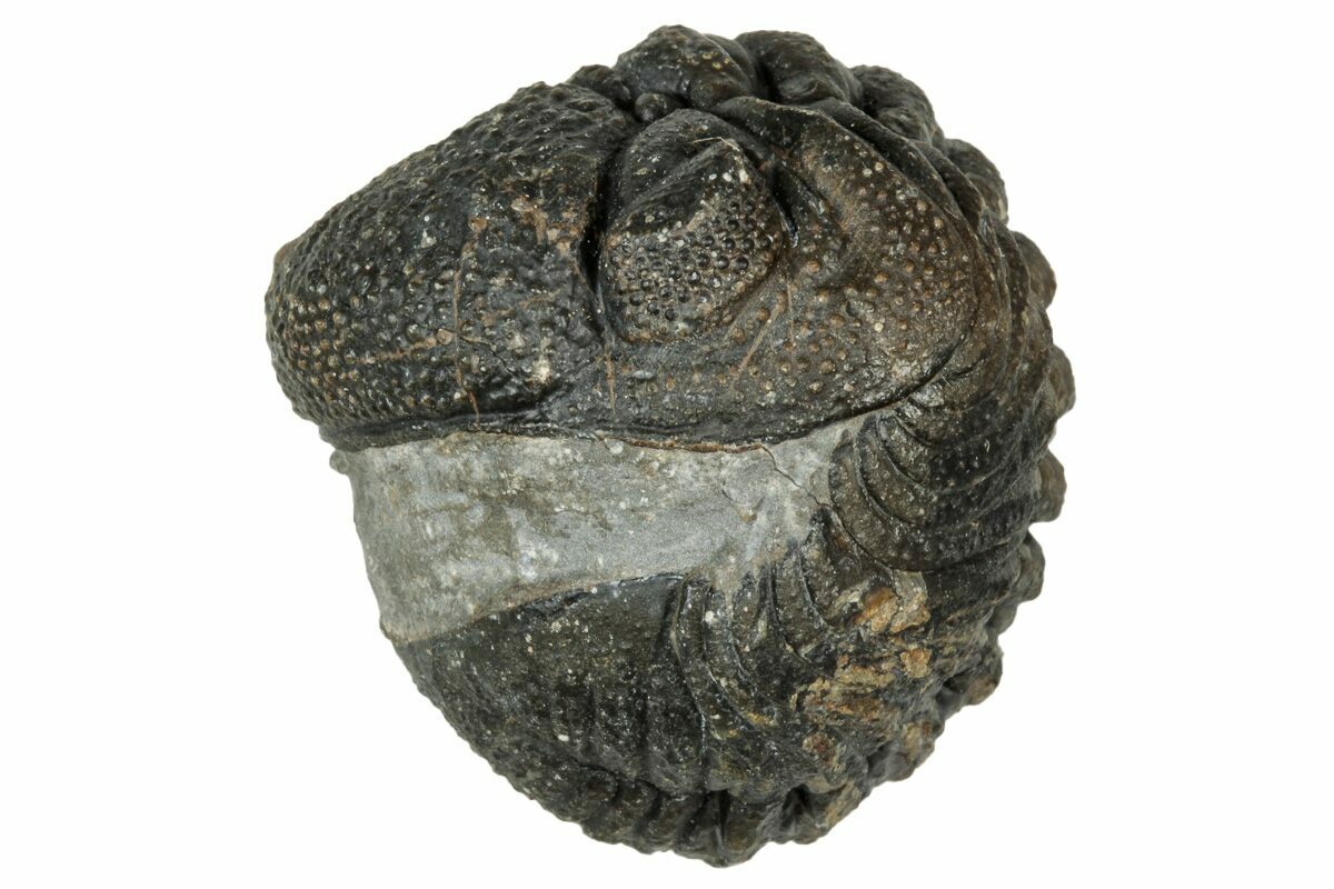 This is an enrolled, 1.1" wide Morocops trilobite from Morocco. Preserved eye facets can be seen in both eyes.
