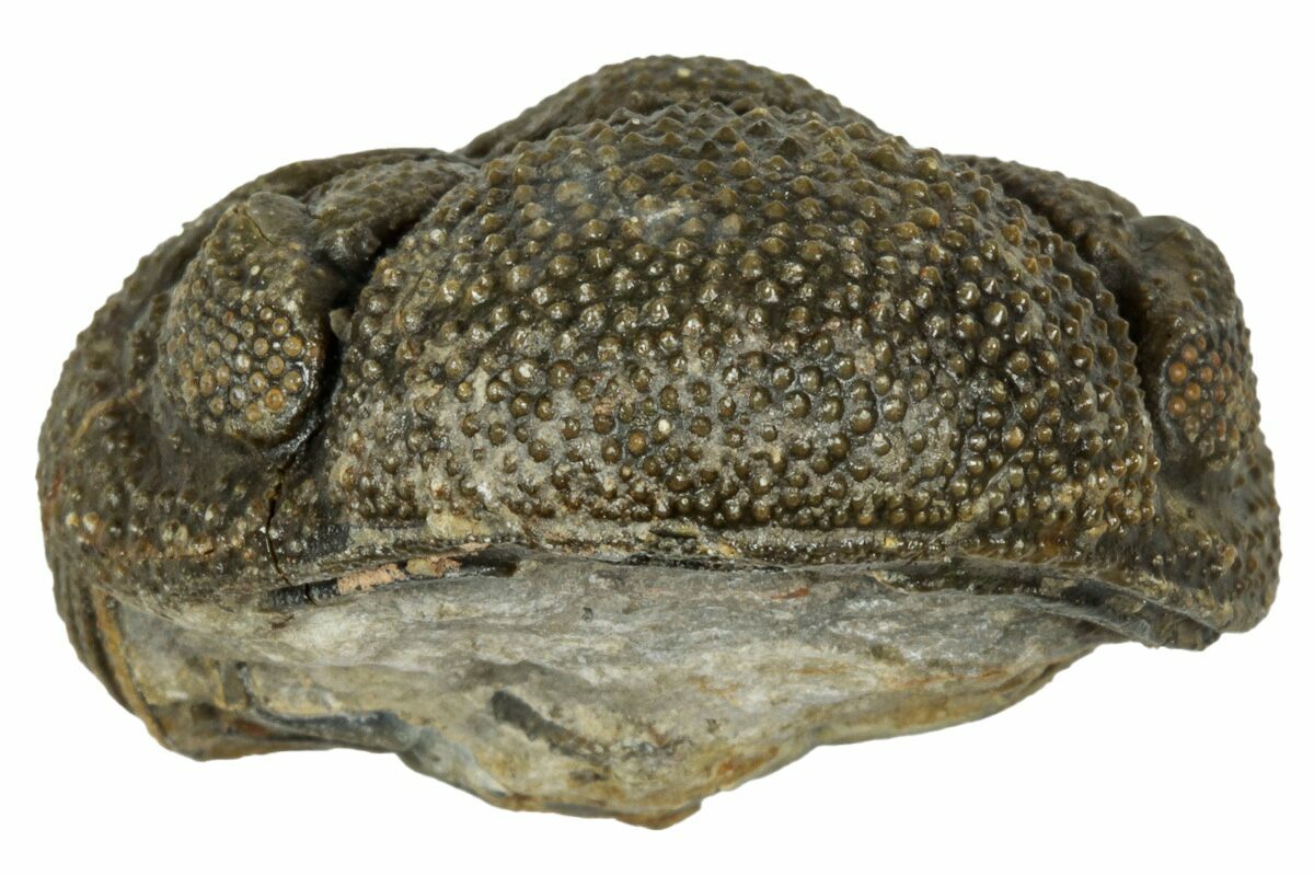 This is an enrolled, 1.1" wide Morocops trilobite from Morocco. The tail is missing, but eye facet preservation can be seen in both eyes.
