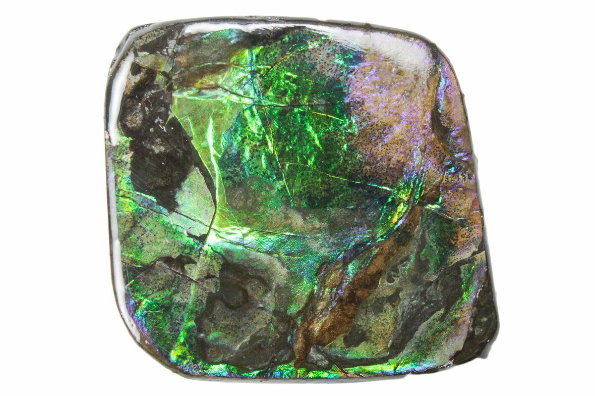 This is a 1.11" wide section of brilliant, iridescent ammolite from the Bear Paw Shale of Alberta, Canada. It has wonderful green, blue, and yellow hues that shimmer differently when viewed from different angles.