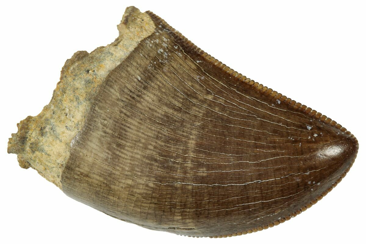 This is an absolutely gorgeous 1.29" long tooth from Tyrannosaurus rex, collected from the Lance (Creek) Formation of Wyoming. It's rather robust with beautiful serration preservation along both edges. True T. rex teeth are some of the most sought-after and collectible fossils out there.