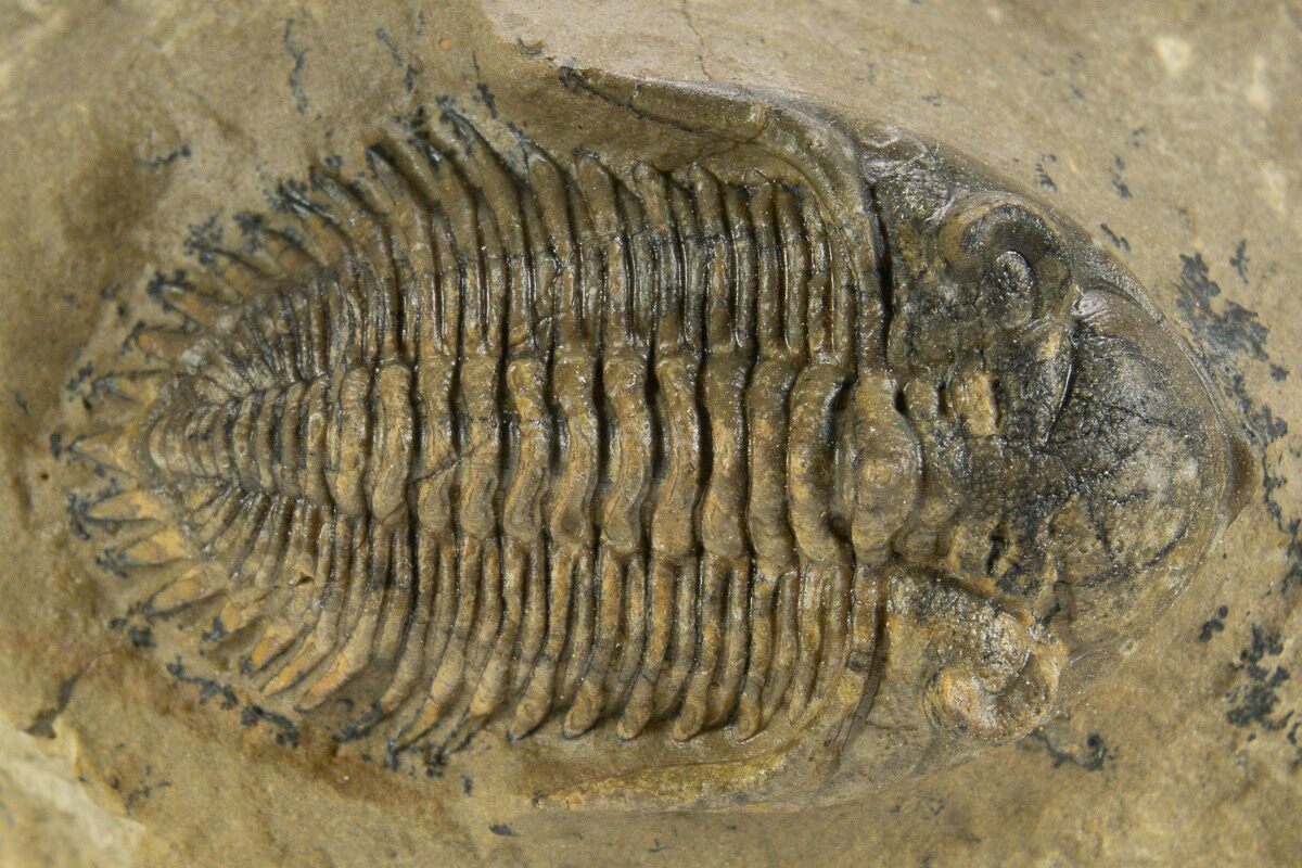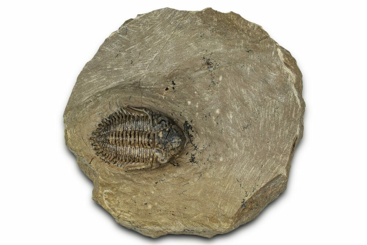 This is a diminutive but detailed 1.15" long Metacanthina issoumourensis trilobite collected near Issoumour, Morocco. It’s preserved in a clean, prone position and displays excellent detail, including tiny eye facets in both eyes. It has no restoration.