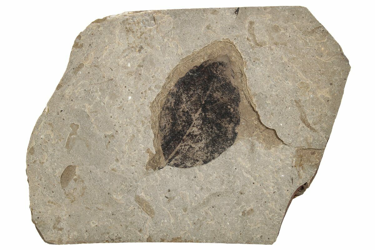 This is a fossil leaf plate from the McAbee fossil beds of British Columbia, Canada. It contains a small 1.15" leaf, most likely of the genus Fagus.