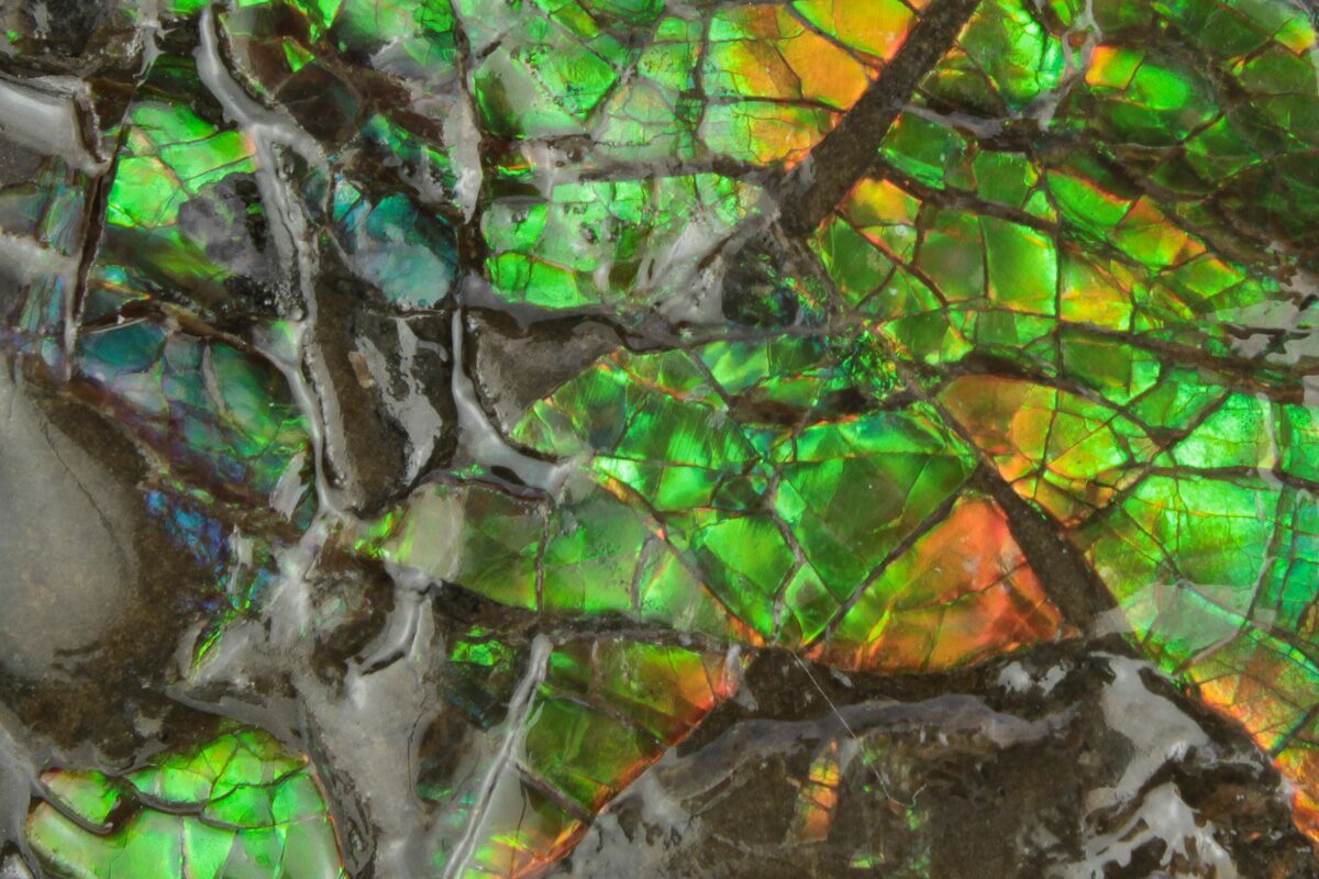 Ammolite is an opal-like gemstone found primarily in Alberta, Canada. It is a kind of fossilized shell from ammonites, which in turn are composed primarily of aragonite, the same mineral contained in nacre (mother-of-pearl). The shell's microstructures are often preserved. In 1981, ammolite was given official gemstone status by the World Jewellery Confederation (CIBJO).