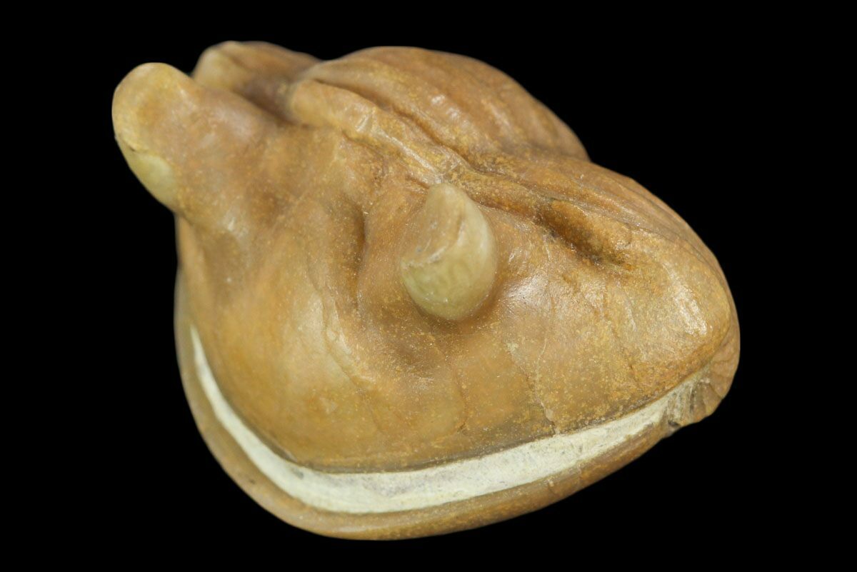 This is a cute, 1.15" wide, Asaphus punctatus trilobite that is enrolled into a defensive posture. Excellent shell preservation with intact, stalk eyes. It comes from the Middle Ordovician deposits near the Volkhov River in the St. Petersburg Region of Russia.