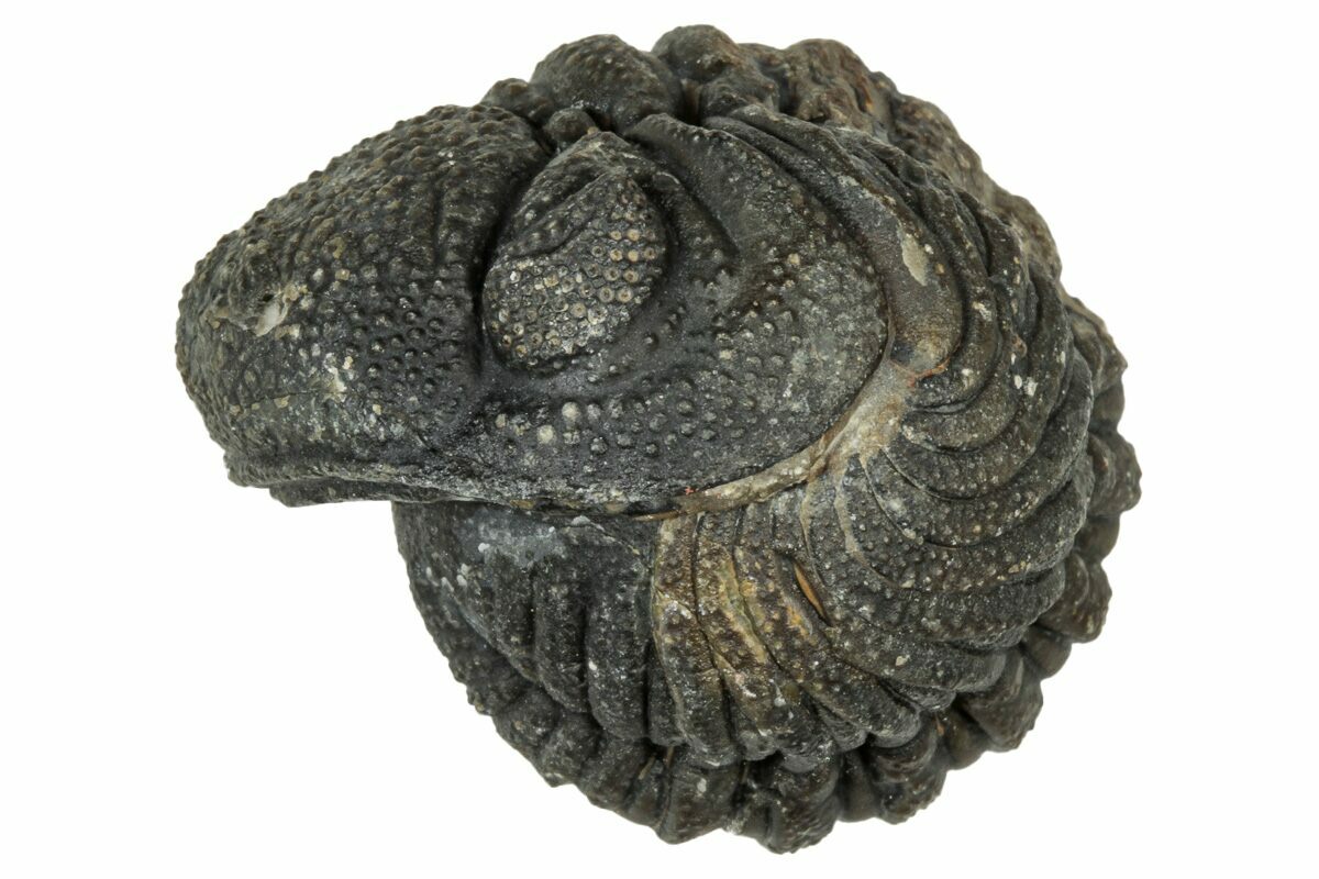 This is an enrolled, 1.15" wide Morocops trilobite from Morocco. Preserved eye facets can be seen in both eyes.