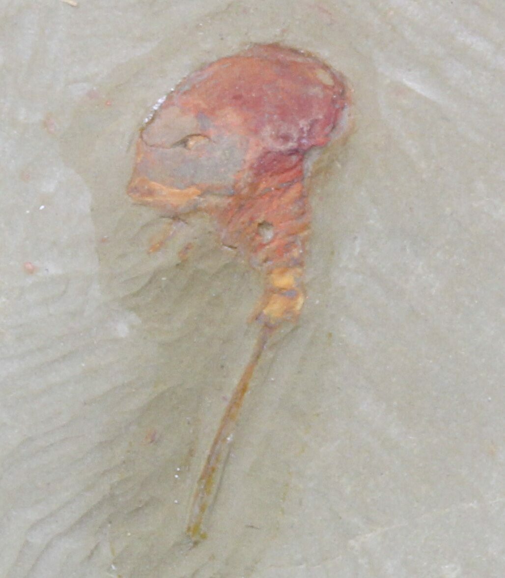 This is a fine specimen of a Lower Ordovician arthropod which would be a member of order Xiphosurida. Xiphosurida is believed to be a very ancient ancestor or at least closely related to the modern day horseshoe crab. This specimen is 1.15" long including the telson (tail spine) and has a beautiful orange/red coloration due to the oxidation of iron pyrite. It comes from the Upper Fezouata Formation near Zagora, Morocco.
