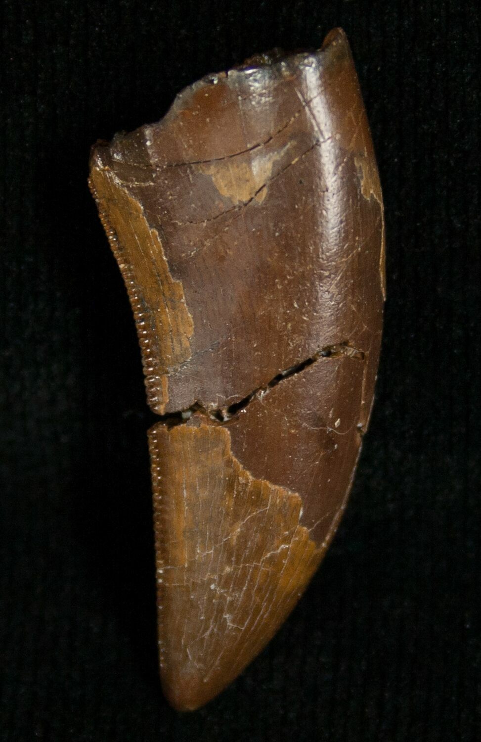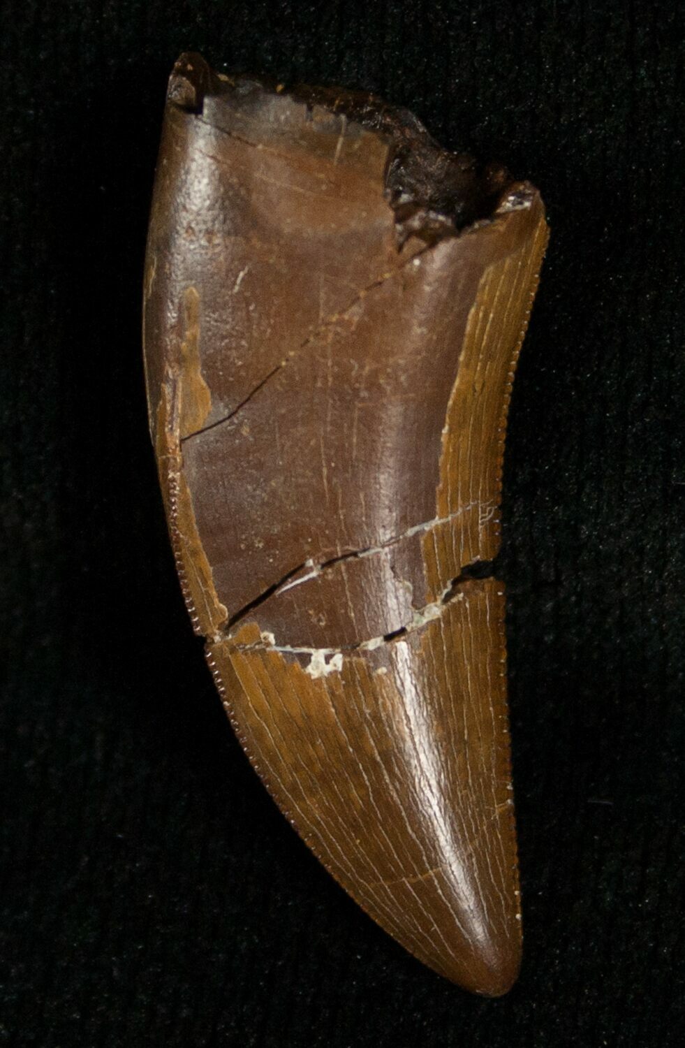 This is an beautiful 1.33" long Nanotyrannus lancensis tooth from the Hell Creek Formation of South Dakota. It has superb enamel preservation, fine serrations and just a single crack repair with no restoration. Really a nice quality, tyrannosaurid tooth.