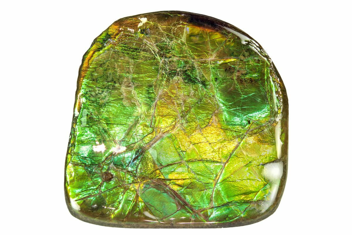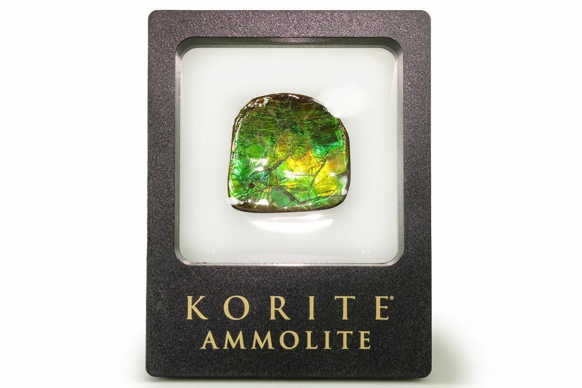 This is a 1.2" wide section of brilliant, iridescent ammolite from the Bear Paw Shale of Alberta, Canada. It has wonderful green, blue, and yellow hues that shimmer differently depending on what angle the specimen is viewed from.