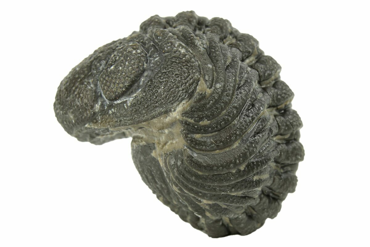 This is a enrolled, 1.2" long (if outstretched) Morocops trilobite from Morocco. It has a very bumpy shell and excellent eye facet detail in both eyes.