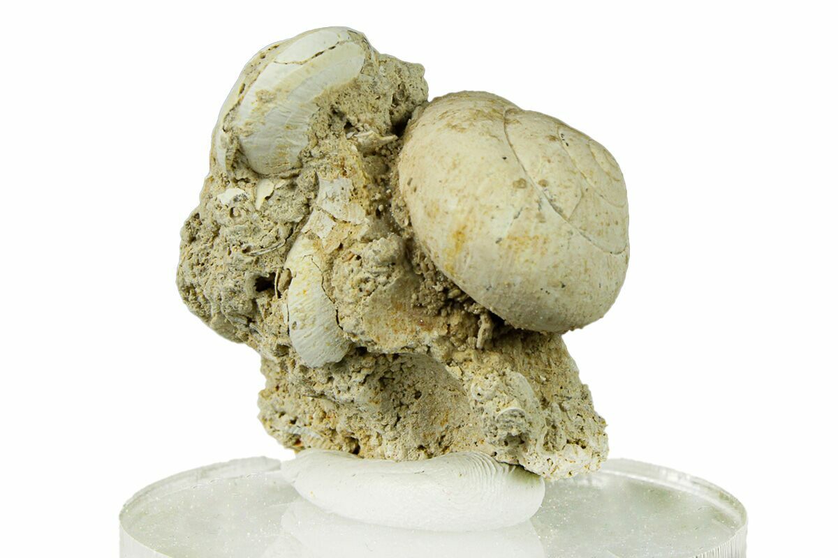 This is a 1.2" cluster of beautifully preserved fossil gastropods (Helix arvernensis) from a Miocene-aged deposit in Montaigu-le-Blin in central France. It has been mounted to an acrylic display base.