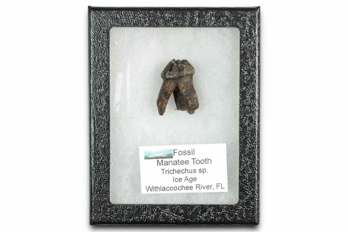 This is a 1.2" long fossilized manatee tooth collected from a Late Pleistocene-aged deposit in the Withlacoochee River of Florida. It's in great condition with an intact crown and preserved roots.