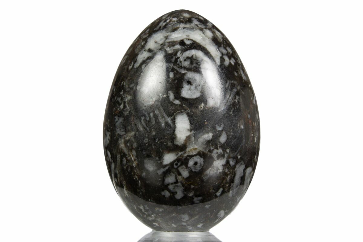 This is a polished egg carved from fossil shell/crinoid hash (shell and crinoid cross sections in rock) collected in Utah. This specimen measures 1.2 inches tall and has been expertly polished to a glossy finish.