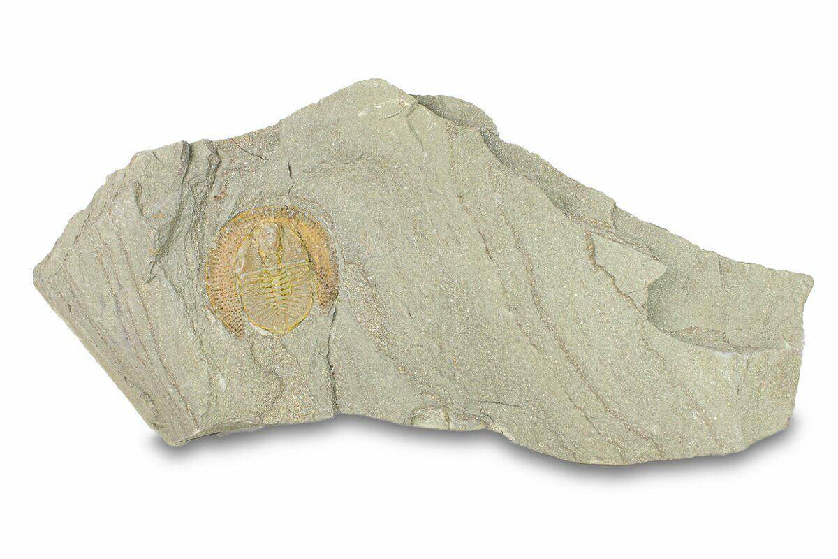 This is a 1.2" wide specimen of the Trinucleid trilobite Declivolithus from Morocco. It has natural orange preservation due to the oxidation of iron pyrite which had replaced the fossil. The trilobite has excellent detail and comes with an acrylic display stand. There is a repaired crack running through the shale and the trilobite.