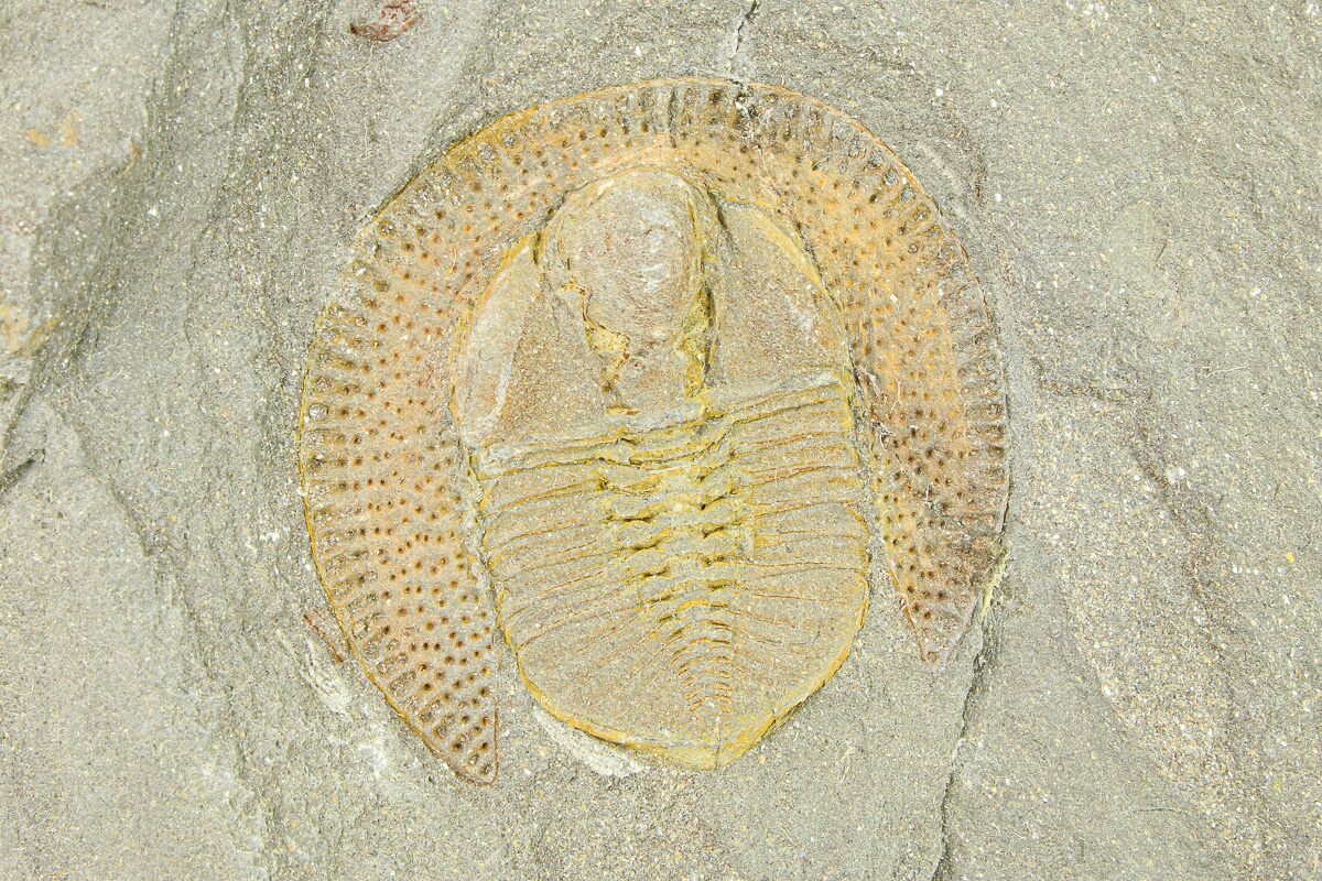 This trilobite has really dramatic cephalic pits along its "head shield". The exact purpose of these pits is unknown, but theories are that they could have had sensory purposes or aided in filter feeding.