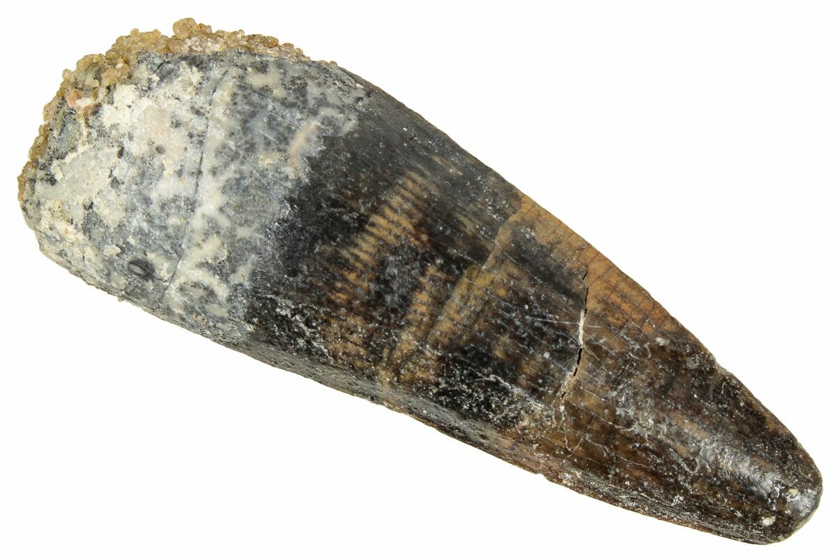 Spinosaurus teeth are relatively common fossils, but large (3+ inches), well-preserved examples are rare. These large Spinosaurus teeth will often be heavily doctored. We’ve seen many examples where multiple partial teeth can been glued to together to create a larger fake tooth, or where enamel has been painted on. One giveaway to look for is a ring of sand around the middle of the tooth, usually glued on to hide a break. Sometimes this is a sign that multiple partial teeth have been composited, but other times it is used to disguise a badly done repair job.