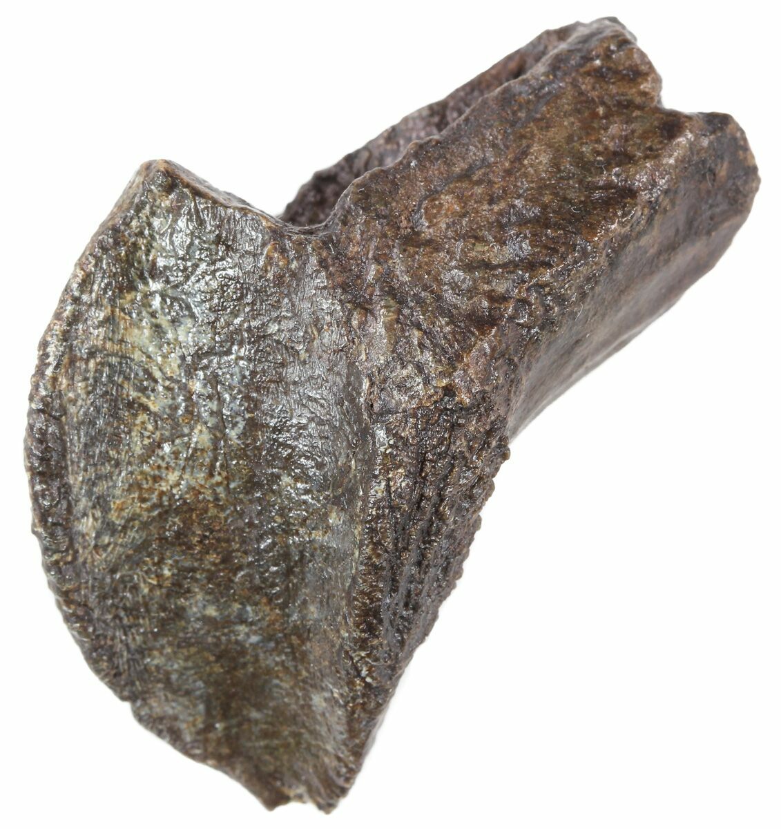 This is a nice, Triceratops tooth with minimal feeding wear. It was collected from the Hell Creek Formation in Powder River County, Montana. Triceratops is one of the most iconic dinosaurs, recognizable by almost everyone. The vast majority of teeth found are worn teeth that are shed during the dinosaurs lifetime. The tooth has little wear making it a more uncommon find. It also has a partial root still attached.