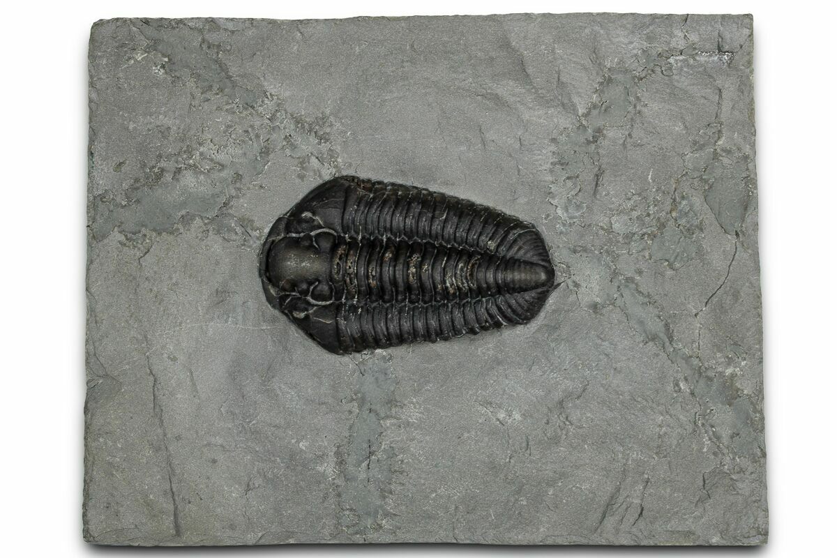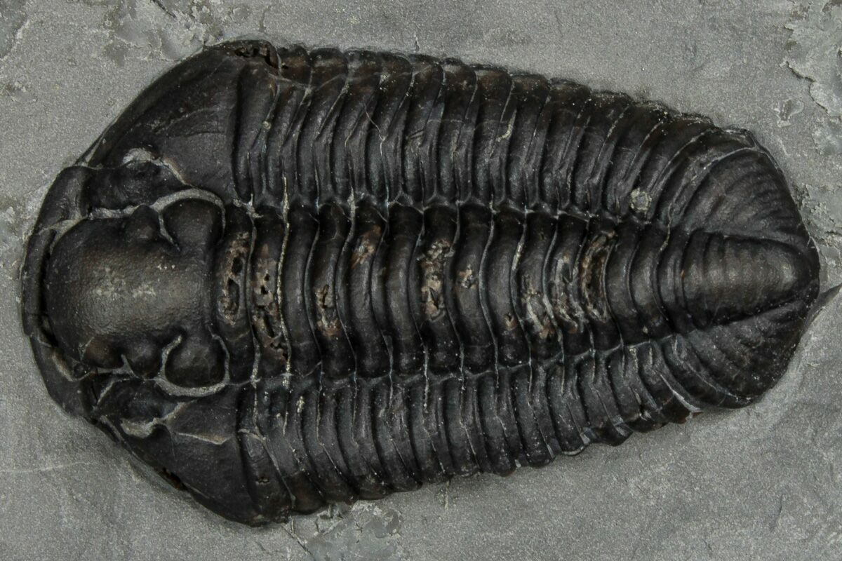 This is a 1.4" long prone Calymene niagarensis trilobite from the Rochester Shale at Caleb's Quarry in Orleans County, New York. It has about 1% restoration on the trilobite as well as some matrix repair work.