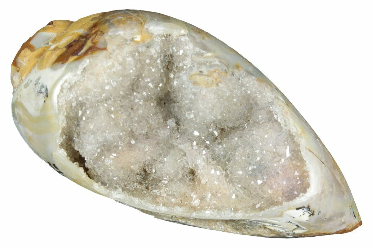 This is a stunning chalcedony replaced gastropod fossil from Betul, India. This specimen has been polished to reveal the once hollow cavity of the shell that has been filled with a pocket of beautiful druzy quartz crystals. It has also been cut flat on the back side so that it displays nicely on a flat surface.