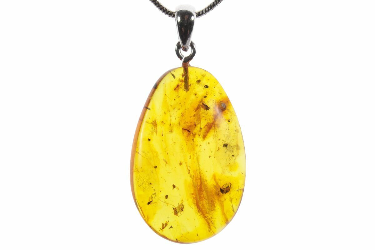 This is a 1.25" tall (including loop) pendant made from 44 million year old Baltic amber. Within the amber, a small fossil fly (order Diptera) and mite (subclass Acari) can be seen. A loop has been attached to the amber, along with a secondary ring for the included 24" silver plated snake chain to complete the necklace.