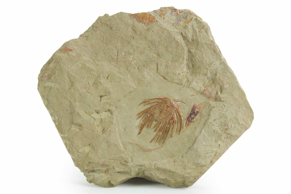 This is a 1.25" long, Selenopeltis binodosa trilobite from the Upper Fezouata Formation in Morocco. The spines have a natural red coloration due to the oxidization of iron pyrite. One of it's antenna is preserved, a rare example of soft bodied preservation from the Fezouata Formation.