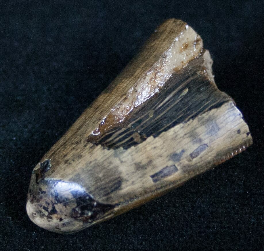 This is a nicely preserved tip of a large Tyrannosaurus rex (T-Rex) tooth from the Hell Creek Formation of Montana. It's 1.25" long with good enamel and exhibits some interesting feeding wear. Some of the serrations are still visible, though they are pretty worn from feeding.