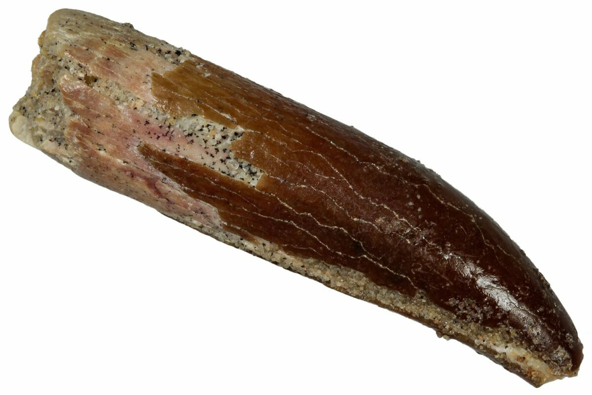 This is a 1.27" long tooth from a Moroccan titanosaur that is currently unidentified. It comes from the Late Cretaceous, Kem Kem Beds of Morocco, home to such meat eating giants as Spinosaurus and Carcharodontosaurus.