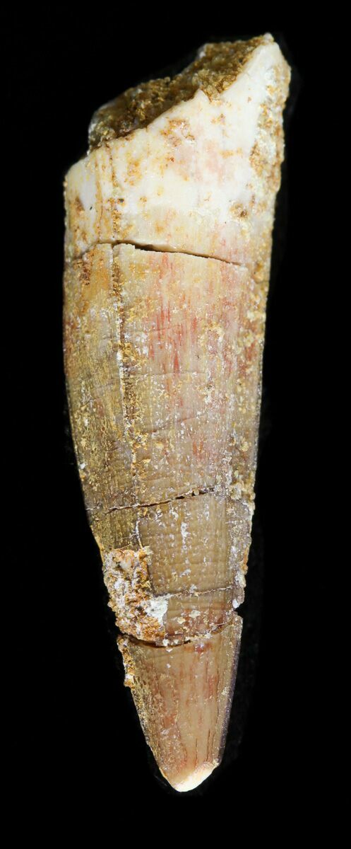 Spinosaurus teeth are relatively common fossils, but large (3+ inches), well-preserved examples are rare. These large Spinosaurus teeth will often be heavily doctored. We’ve seen many examples where multiple partial teeth can been glued to together to create a larger fake tooth, or where enamel has been painted on. One giveaway to look for is a ring of sand around the middle of the tooth, usually glued on to hide a break. Sometimes this is a sign that multiple partial teeth have been composited, but other times it is used to disguise a badly done repair job.