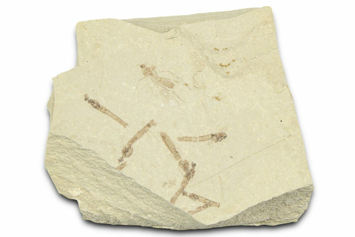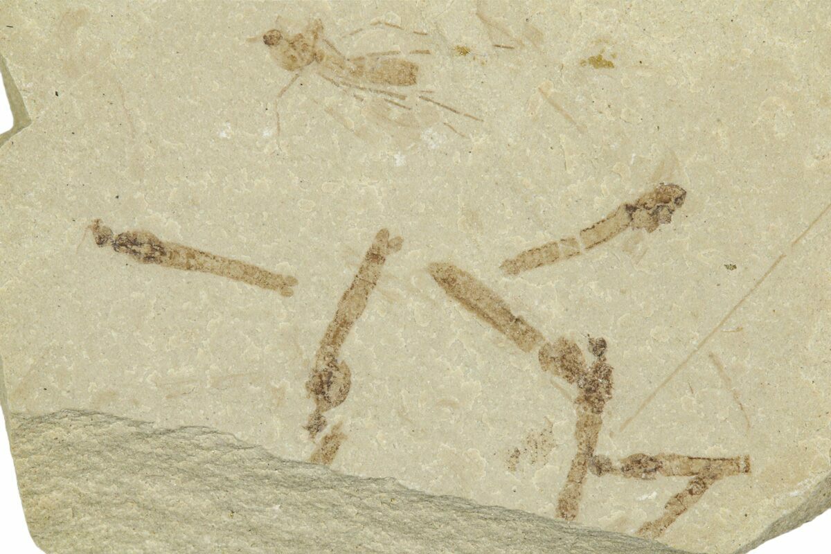 This is a 1.3" wide mortality plate featuring several detailed crane flies (family Tipulidae), collected from the Green River Formation of Utah. While the Green River Formation is best know for its fish fossils, other areas produce incredible plant fossils and insect fauna.