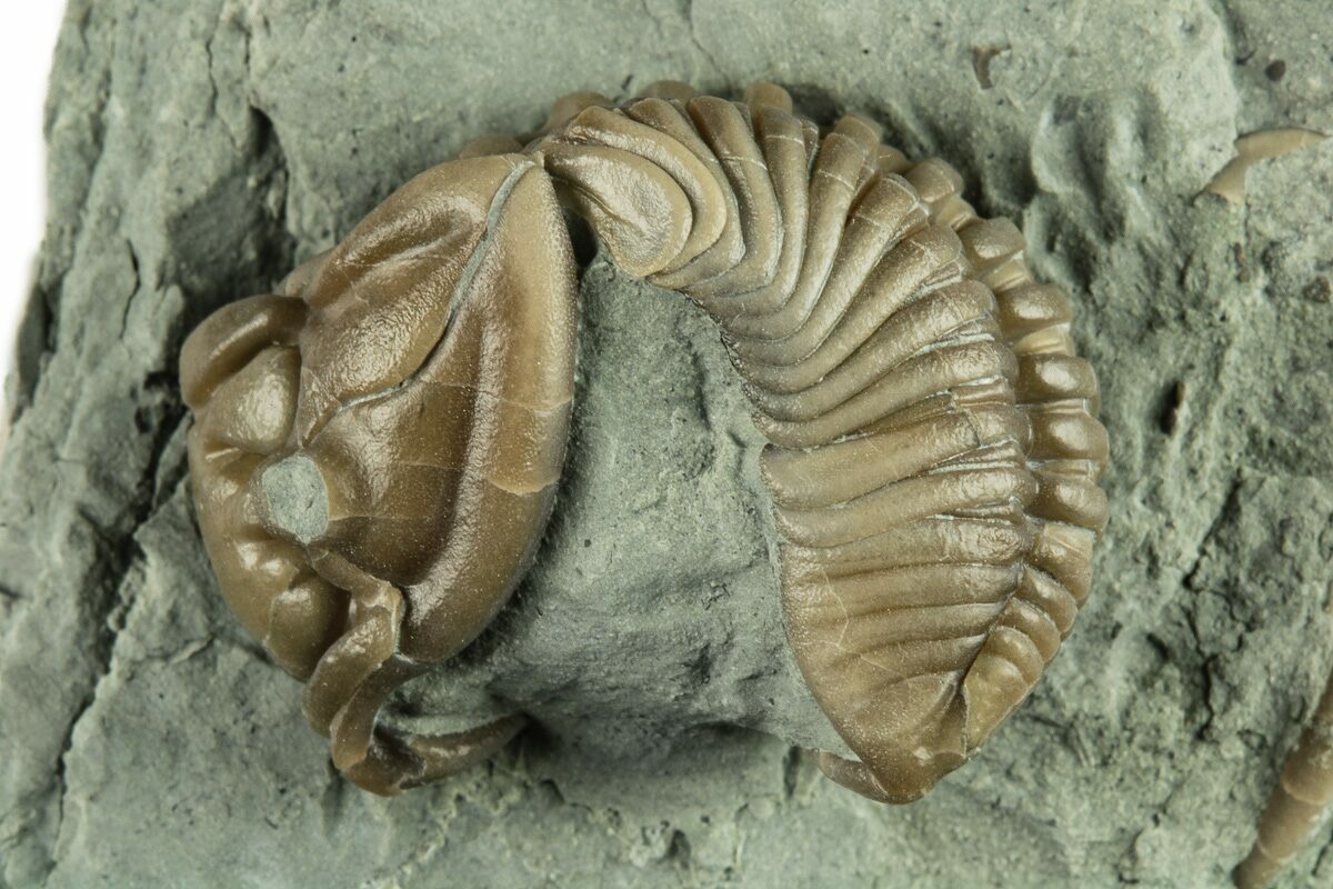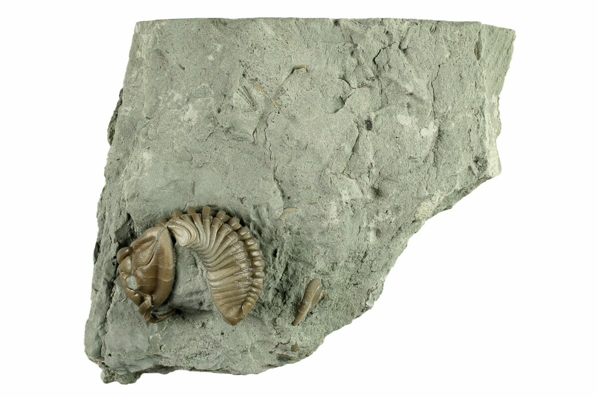 Flexicalymene is often found enrolled, seemingly to protect its softer underside from threats on a sea floor teeming with ancient life and increasingly complex predators. Sealing itself inside the hard carapace may be a protective maneuver, or it may simply be the pose of death.